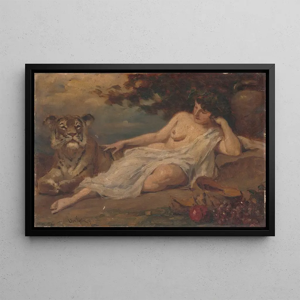 Acte féminin avec tigre : een dans tussen kracht en verfijning. Het werk "Acte féminin avec tigre" van Julius Lederer is een indrukwekkende voorstelling van vrouwelijkheid en dierlijke kracht. Het doek toont een vrouw, met een gracieuze houding, omringd door een majestueuze tijger. De warme kleuren en de opvallende contrasten creëren een sfeer die zowel sensueel als intrigerend is. De techniek van Lederer, die realisme combineert met een vleugje expressionisme, brengt deze gedurfde compositie tot leven. Elk detail, van de delicate trekken van het gezicht van de vrouw tot de felle patronen van de tijger, roept een harmonie op tussen mens en wilde natuur. Julius Lederer : een kunstenaar op het kruispunt van invloeden. Julius Lederer, actief in het begin van de 20e eeuw, is een kunstenaar wiens werk de spanningen en evoluties van zijn tijd weerspiegelt. Geïnspireerd door de Art Nouveau-beweging en symbolistische stromingen, verkent Lederer thema's van sensualiteit en natuur. Zijn werken, vaak bevolkt door vrouwelijke figuren en dieren, onthullen een fascinatie voor schoonheid en kracht. "Acte féminin avec tigre" belichaamt deze dualiteit, waarin vrouw en tijger samenkomen in een visuele dans. Dit stuk getuigt van de betekenis van Lederer in het artistieke landschap van zijn tijd, en blijft relevant vandaag. Een decoratief stuk met vele troeven. De kunstdruk van "Acte féminin avec tigre" is een boeiende toevoeging aan uw interieurdecoratie, of het nu een woonkamer, kantoor of slaapkamer is. Zijn gedurfde esthetiek en levendige kleuren trekken de aandacht en stimuleren gesprekken. De kwaliteit van de kunstdruk garandeert een opmerkelijke trouw aan het originele werk, waardoor u elk detail met bewondering kunt waarderen. Door dit schilderij in uw ruimte te integreren, brengt u een vleugje kunst die zowel kracht als schoonheid oproept, en verrijkt u uw omgeving op een unieke manier.