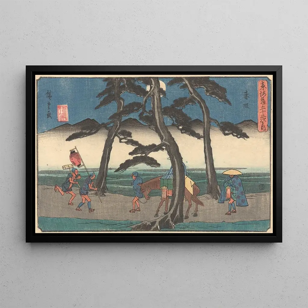 Akasaka : een levendige scène van het Japanse stadsleven In de kunstdruk Akasaka vangt Andō Hiroshige de essentie van een vluchtig moment, waarin natuur en stedelijkheid samenkomen. De opvallende kleuren, variërend van weelderig groen tot diepe roodtinten, creëren een levendige en dynamische sfeer. De houtsnede-techniek, typisch voor ukiyo-e, stelt Hiroshige in staat te spelen met texturen en nuances, waardoor elk detail tot leven komt. De bewegende personages lijken bijna uit het doek te stappen, en nodigen de kijker uit om onder te dompelen in deze levendige scène, waar het dagelijks leven samensmelt met natuurlijke schoonheid. Andō Hiroshige : meester van de Japanse kunstdruk Andō Hiroshige, geboren in 1797, is een van de meest invloedrijke kunstenaars van de ukiyo-e beweging, die bloeide tijdens de Edo-periode in Japan. Zijn stijl onderscheidt zich door een bijzondere aandacht voor landschappen en het dagelijks leven, vaak doordrenkt met melancholie en poëzie. Geïnspireerd door zijn tijdgenoten en de omringende natuur, wist Hiroshige werken te creëren die de tijd overstijgen en onmiskenbare referenties vormen in de Japanse kunst. Zijn vermogen om de vergankelijke schoonheid van seizoenen en levensmomenten vast te leggen, maakte hem tot een pionier wiens nalatenschap nog steeds voortleeft. Een decoratief stuk met vele voordelen De kunstdruk Akasaka is een ideaal decoratief stuk om je interieur te verrijken, of het nu in een woonkamer, kantoor of slaapkamer is. De kwaliteit van de afdruk en de trouw aan het originele werk garanderen een onmiskenbare esthetische aantrekkingskracht. Door dit schilderij in je inrichting te integreren, voeg je een vleugje exotisme en Japanse cultuur toe, terwijl je een rustgevende en inspirerende sfeer bevordert. Dit doek zal je gasten aanspreken en hun nieuwsgierigheid wekken, waardoor je ruimte een plek wordt van delen en ontdekken.