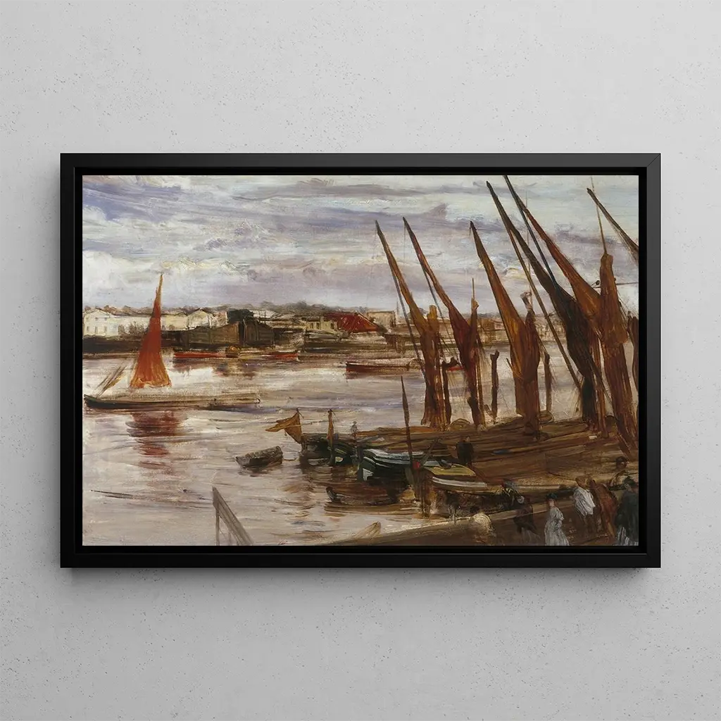 James Abbott McNeill Whistler, een onmiskenbare figuur van de impressionistische beweging, wist kleur en licht op een vernieuwende manier te combineren. Geboren in 1834 in de Verenigde Staten, vestigde hij zich in Parijs, waar hij zich liet beïnvloeden door hedendaagse kunstenaars, terwijl hij zijn eigen stijl ontwikkelde. Whistler staat bekend om zijn werken die vluchtige momenten vastleggen, vaak geïnspireerd door het stadsleven en de natuur. Zijn creatieve periode, die zich uitstrekt van het midden van de 19e eeuw tot zijn laatste jaren, wordt gekenmerkt door een voortdurende zoektocht naar chromatische harmonie. Battersea Reach is een perfect voorbeeld van zijn vernieuwende aanpak, waarbij elke penseelstreek bijdraagt aan een unieke visuele ervaring.