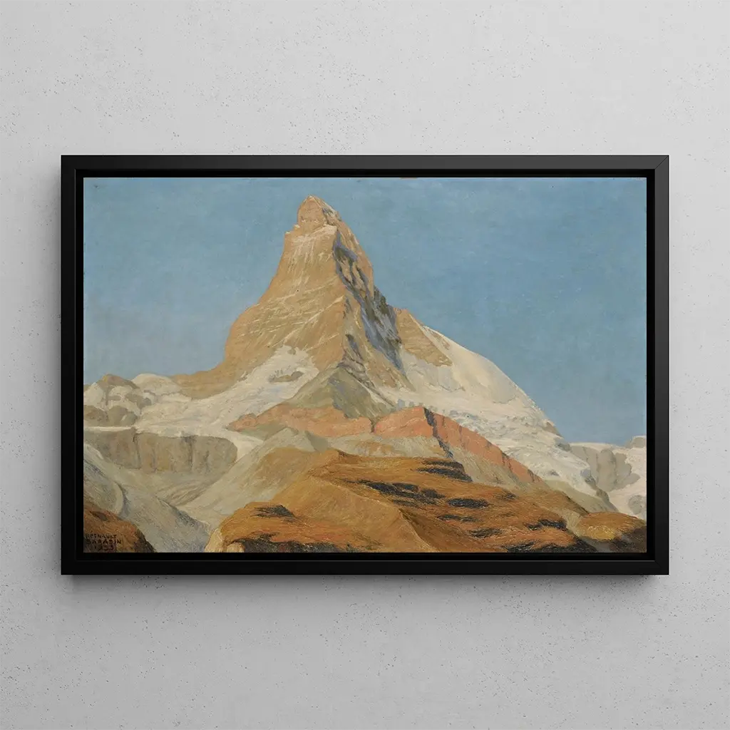 "Le Cervin" van Regnault Sarasin is een kunstdruk die de grootsheid van de Zwitserse bergen vastlegt met een verbluffende intensiteit. Het doek beeldt de beroemde top af, badend in gouden licht, en creëert een opvallend contrast tussen de schaduwen van de rotsen en de helderheid van de hemel. De levendige kleuren en de minutieuze details tonen Sarasin's meesterschap in het weergeven van alpiene landschappen. De sfeer van dit kunstwerk is zowel majestueus als sereen, en nodigt de kijker uit om de kracht van de natuur te voelen. Elke penseelstreek roept de wilde schoonheid en de immense omvang van de bergen op, en transporteert de toeschouwer naar een onvergetelijke visuele reis.