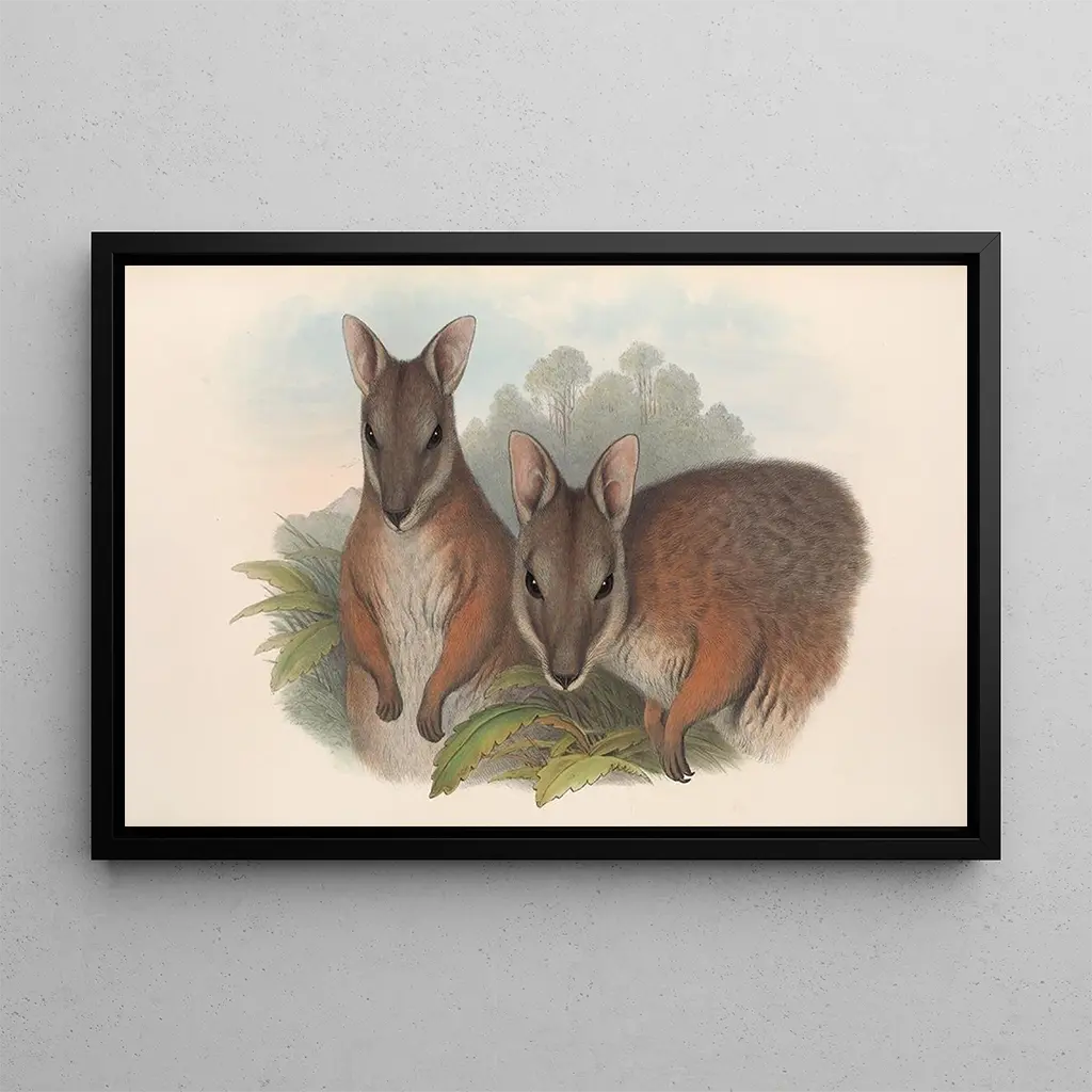 De kunstdruk Les mammifères d'Australie Pl065 dompelt ons onder in de fascinerende wereld van de Australische biodiversiteit. John Gould, natuuronderzoeker en illustrator, legt met opmerkelijke precisie de vormen en kleuren van inheemse soorten vast. De minutieuze details van elk zoogdier, van de texturen van hun vacht tot de nuances van hun leefgebieden, creëren een levendige en meeslepende sfeer. Het kleurenpalet, variërend van aardse bruintinten tot weelderige groenen, roept de rijkdom van de Australische landschappen op. Dit kunstwerk is veel meer dan een eenvoudige illustratie; het is een ode aan de natuur, die de kijker uitnodigt om de wonderen van de fauna te verkennen.