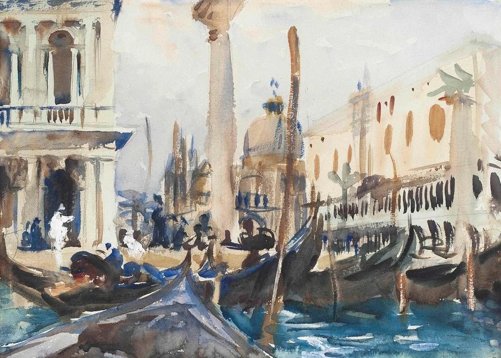 John Singer Sargent, geboren in 1856 in Florence, was een Amerikaanse kunstenaar van Italiaanse afkomst, beroemd om zijn portretten en landschappen. Werkend aan het einde van de 19e en het begin van de 20e eeuw, wist hij de geest van zijn tijd vast te leggen, waarbij hij Europese en Amerikaanse invloeden combineerde. Sargent werd opgeleid aan de Académie Julian in Parijs, waar hij een unieke stijl ontwikkelde, die realisme en impressionisme combineert. Zijn werk, rijk aan details en emoties, maakte hem een van de meest gewilde kunstenaars van zijn tijd, en "De Piazzetta met Gondels" getuigt van zijn vermogen om de schoonheid van plaatsen en mensen te vereeuwigen.