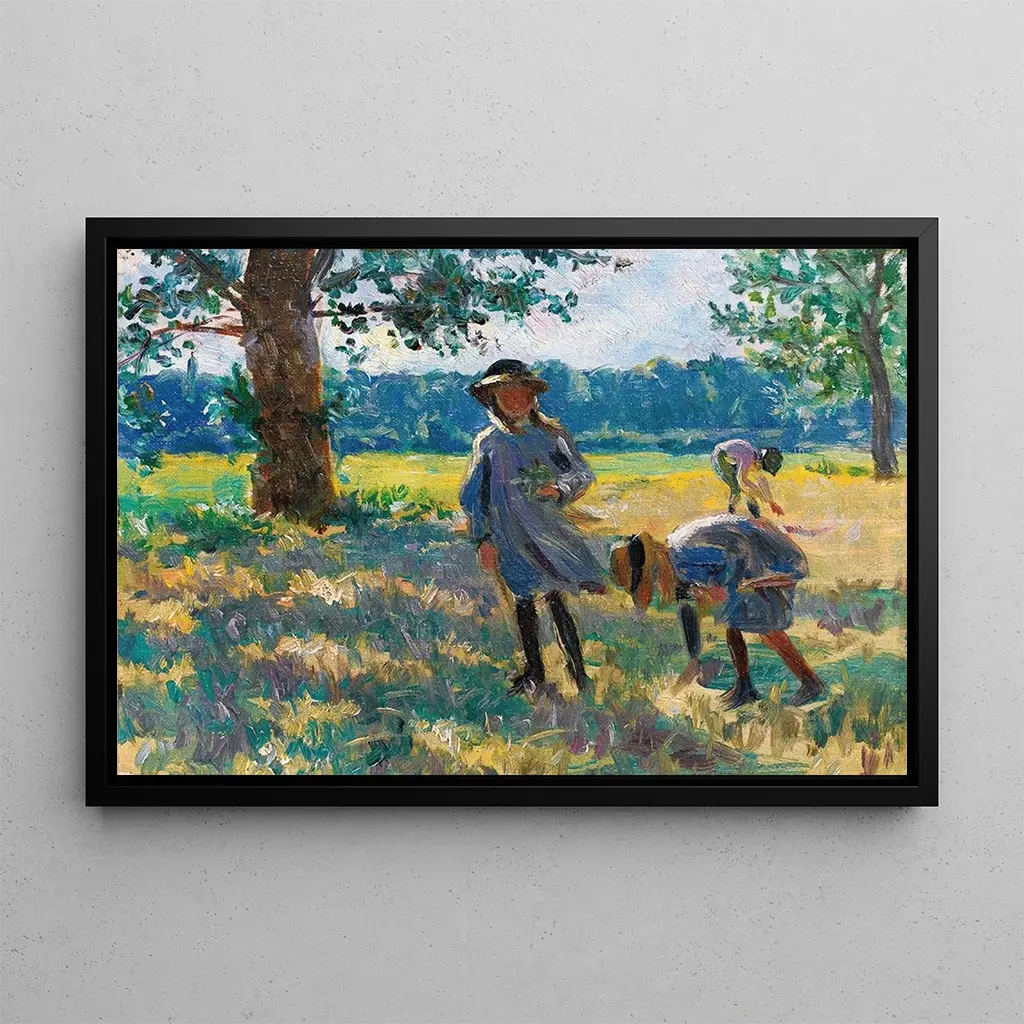 "De bloemen plukken" van Henri Lebasque is een kunstdruk die de schoonheid van de natuur viert door middel van heldere kleuren en een dynamische compositie. De personages, vrolijk bezig met het plukken, lijken te dansen op het ritme van het licht dat de bloemblaadjes streelt. De pastelkleuren en de levendige accenten creëren een sfeer van geluk en lichtheid, en nodigen de kijker uit om dit moment van verbondenheid met de natuur te delen. De impressionistische techniek van Lebasque, met zijn vloeiende penseelstreken, brengt de scène tot leven en transformeert een eenvoudige handeling in een ware viering van het leven.