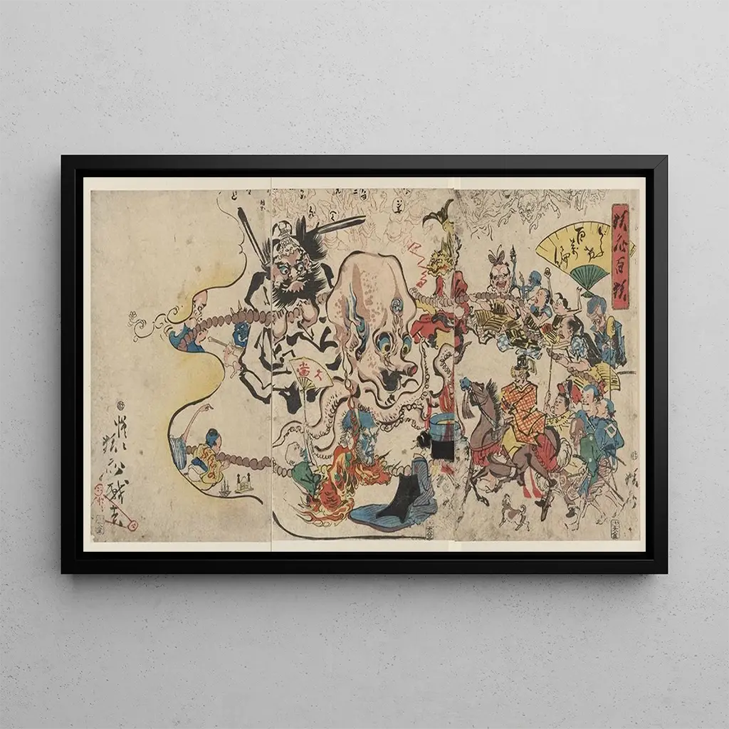 Dke Hyakumanben : een muurschildering van leven en kleuren De kunstdruk Dke Hyakumanben van Kawanabe Kyōsai is een levendig werk dat een veelheid aan personages en scènes uit het dagelijks leven in Japan oproept. De heldere kleuren en de minutieuze details dompelen de kijker onder in een rijk universum vol emoties en verhalen. De houtsnede-techniek, typisch voor de Edo-periode, stelt de kunstenaar in staat te spelen met licht en schaduw, waardoor een dynamische en levendige sfeer ontstaat. Elke figuur, elke beweging lijkt een verhaal te vertellen, uitnodigend tot contemplatie en persoonlijke interpretatie. Kawanabe Kyōsai : een meester van ukiyo-e in de 19e eeuw Kawanabe Kyōsai, actief in de tweede helft van de 19e eeuw, is een van de laatste grote meesters van ukiyo-e, een Japanse houtsnede-stijl die haar hoogtepunt bereikte tijdens de Edo-periode. Geïnspireerd door de artistieke tradities van zijn tijd, wist hij elementen van de westerse cultuur te integreren terwijl hij de essentie van de Japanse kunst behield. Zijn carrière werd gekenmerkt door een verlangen naar experimenteren en innovatie, wat hem onderscheidde in een snel veranderende artistieke wereld. Zijn werken, zoals Dke Hyakumanben, getuigen van zijn vaardigheid om het leven in al zijn vormen vast te leggen, waardoor hij een onmisbare figuur is in de geschiedenis van de Japanse kunst. Een decoratief stuk met vele voordelen De kunstdruk Dke Hyakumanben is een decoratief stuk dat harmonieus integreert in diverse ruimtes, of het nu een woonkamer, kantoor of slaapkamer is. De kwaliteit van de afdruk en de trouw aan de originele kleuren garanderen een indrukwekkend esthetisch resultaat, terwijl het een vleugje exotisme en cultuur aan uw interieur toevoegt. Dit schilderij trekt de aandacht en stimuleert gesprekken, waardoor het een centraal element wordt in uw decoratie. Door voor dit doek te kiezen, kiest u voor een werk dat schoonheid, geschiedenis en traditie combineert, en zo uw omgeving op een betekenisvolle manier verrijkt.