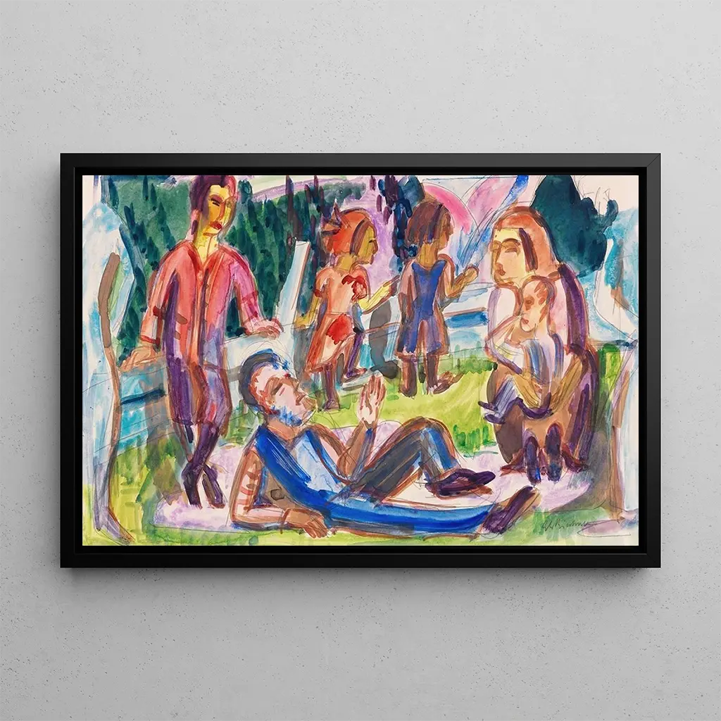 In dit levendige kunstwerk vangt Ernst Ludwig Kirchner de essentie van het gezinsleven in de open lucht, midden op een groene weide. De heldere kleuren en gestileerde vormen creëren een vrolijke en dynamische sfeer, waarin de personages lijken te dansen op het ritme van de natuur. De expressieve techniek van Kirchner, kenmerkend voor de expressionistische beweging, brengt elk detail tot leven, van lachende gezichten tot de vloeiende bewegingen van de lichamen. Dit kunstwerk roept een harmonie op tussen mens en omgeving, en nodigt de kijker uit om de warmte en de gezelligheid van dit gedeelde moment te voelen.