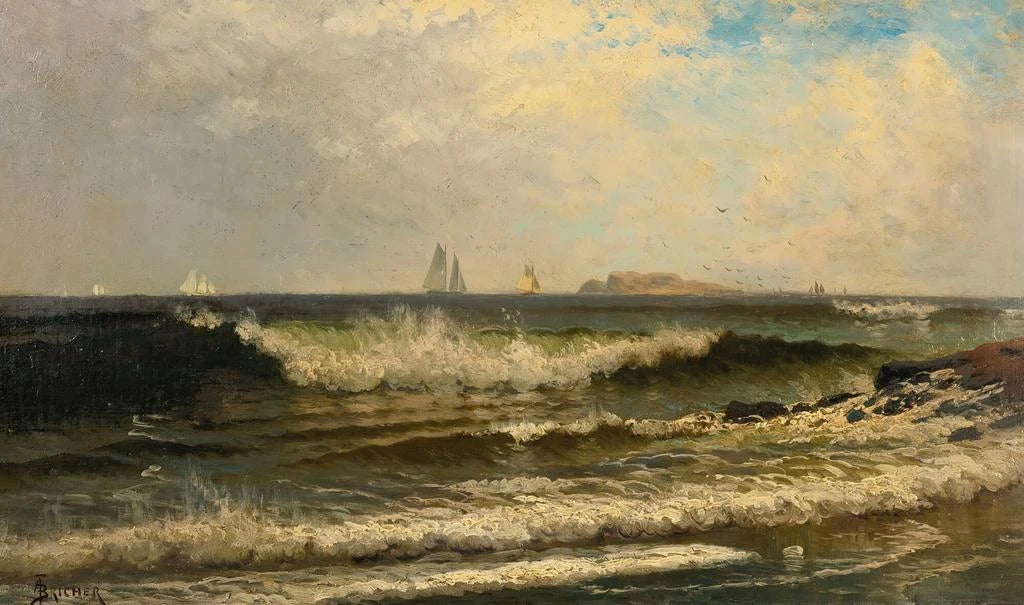 Alfred Thompson Bricher, actief in de 19e eeuw, wordt erkend om zijn maritieme landschappen die de essentie van de zee vastleggen. Geïnspireerd door de impressionistische beweging, ontwikkelde hij een unieke stijl die precisie en expressiviteit combineert. Zijn werken getuigen van een diepe bewondering voor de natuur, vaak geïnspireerd door zijn reizen langs de Amerikaanse kusten. Bricher was ook lid van de American Watercolor Society, wat zijn belang in de wereld van maritieme kunst en zijn blijvende nalatenschap onderstreept.