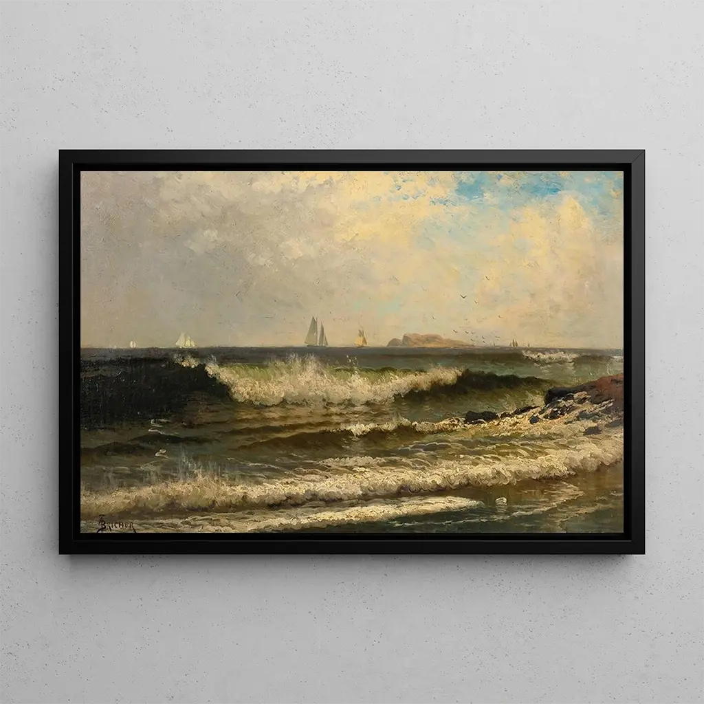 In dit boeiende kunstwerk dompelt Alfred Thompson Bricher ons onder in een woelige zee, waar de vloedgolven krachtig opwellen. De tinten blauw en wit mengen harmonieus, waardoor een sfeer ontstaat die zowel dramatisch als sereen is. De techniek van de kunstenaar, die realisme en impressionisme combineert, brengt elke druppel water en elk lichtpunt tot leven. Het werk nodigt uit tot contemplatie, en roept de kracht van de natuur en de wilde schoonheid van de oceanen op.