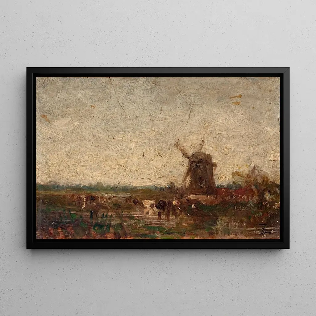In deze kunstdruk van "Holland, de molen" brengt Félix Ziem ons naar het hart van een idyllisch landschap, waar de zachtheid van de kleuren en de fijnheid van de details samenkomen om een rustige sfeer te creëren. De tinten blauw en groen roepen de frisheid van rivieren en velden op, terwijl de molen, majestueus, trots tegen de hemel oprijst. Ziem's techniek, waarbij olie en penseel worden gecombineerd, brengt elk element tot leven, van de reflecties op het water tot de drijvende wolken. Dit schilderij nodigt uit tot contemplatie, tot dagdromen, en herinnert ons aan de schoonheid van natuurlijke landschappen.