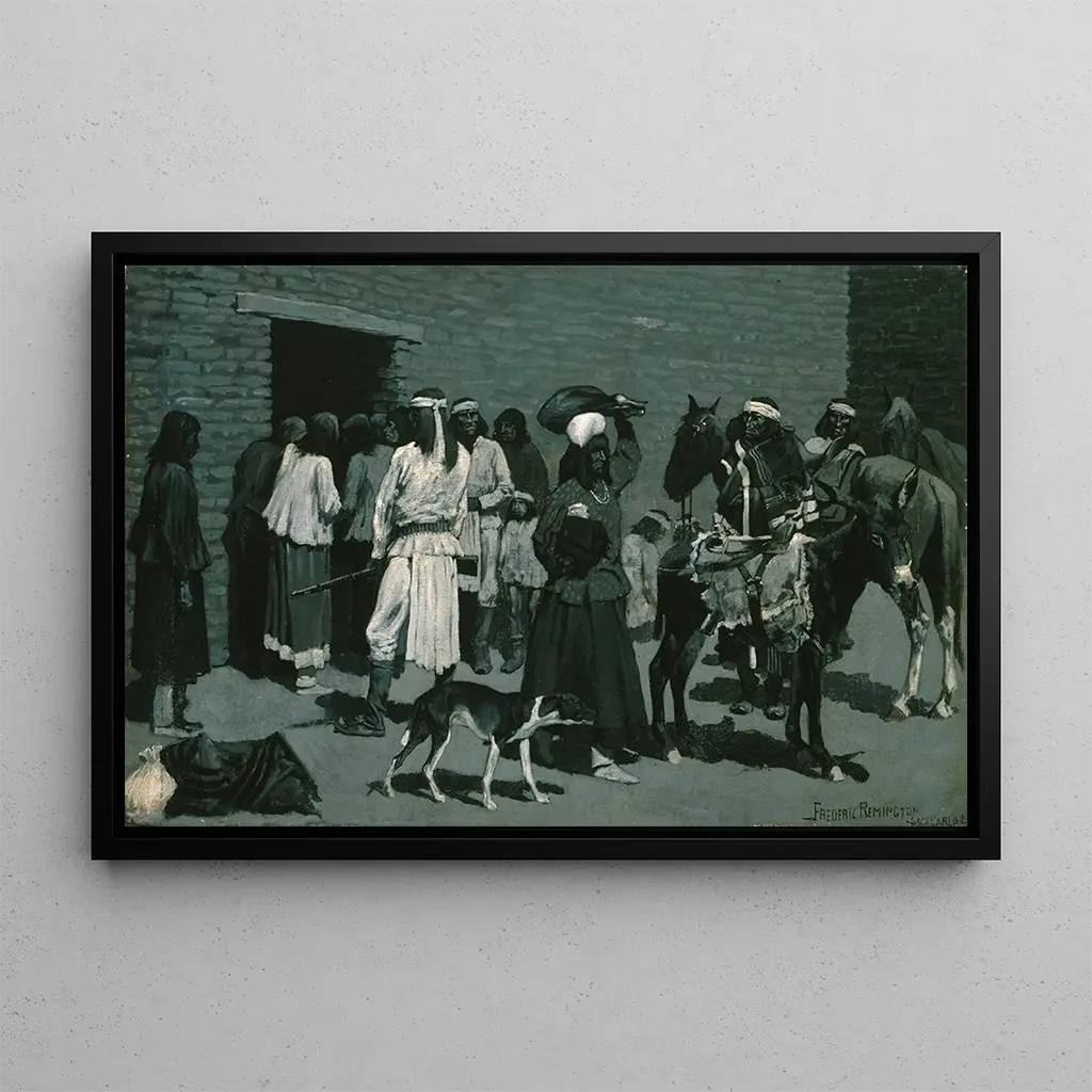 De kunstdruk Village indien Pueblo van Frederic Remington brengt ons naar de majestueuze landschappen van het Amerikaanse zuidwesten. Dit levendige kunstwerk beeldt een scène uit het leven in een Pueblo-dorp af, waar de adobe-huizen harmonieus opgaan in het natuurlijke decor. De warme kleuren, variërend van oker tot diepe roodtinten, roepen de aarde en de hemel op, terwijl de personages, gekleed in traditionele kostuums, een menselijke dimensie toevoegen aan deze voorstelling. Remington, met zijn precieze en dynamische techniek, slaagt erin de essentie van de inheemse cultuur vast te leggen en eert een levenswijze die in perfecte symbiose met de natuur leeft.