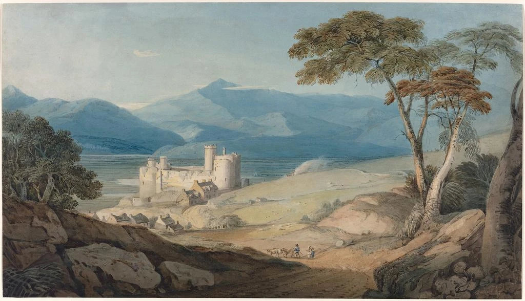 De kunstdruk Château de Harlech et Snowdon van John Varley brengt de kijker in een betoverend landschap van Wales. De tinten groen en blauw vermengen zich harmonieus, en roepen de majesteit van de bergen en de sereniteit van de hemel op. Het kasteel, imposant en vol geschiedenis, staat trots op de voorgrond, terwijl de toppen van Snowdon op de achtergrond verschijnen, wat een opvallend contrast creëert. De aquareltechniek van Varley, met zijn delicate washes, geeft een zachte en dromerige sfeer aan dit werk, en nodigt uit tot contemplatie van de natuurlijke en architectonische schoonheid.
