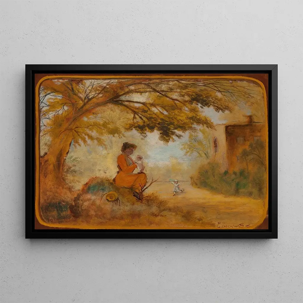 De kunstdruk van Moeder en kinderen, gemaakt door Louis Michel Eilshemius, roept een scène van gezinsleven op die doordrenkt is van zachtheid en tederheid. De pastelkleuren en de delicate vormen van de personages creëren een warme, bijna intieme sfeer. De kunstenaar slaagt erin een vluchtig moment van gedeeld geluk vast te leggen, waarin de blikken tussen moeder en haar kinderen spreken van liefde en verbondenheid. De olieverf op doek-techniek maakt het mogelijk de zachte texturen van de kleding en de helderheid van de gezichten weer te geven, wat bijdraagt aan de emotionele diepte van het werk.