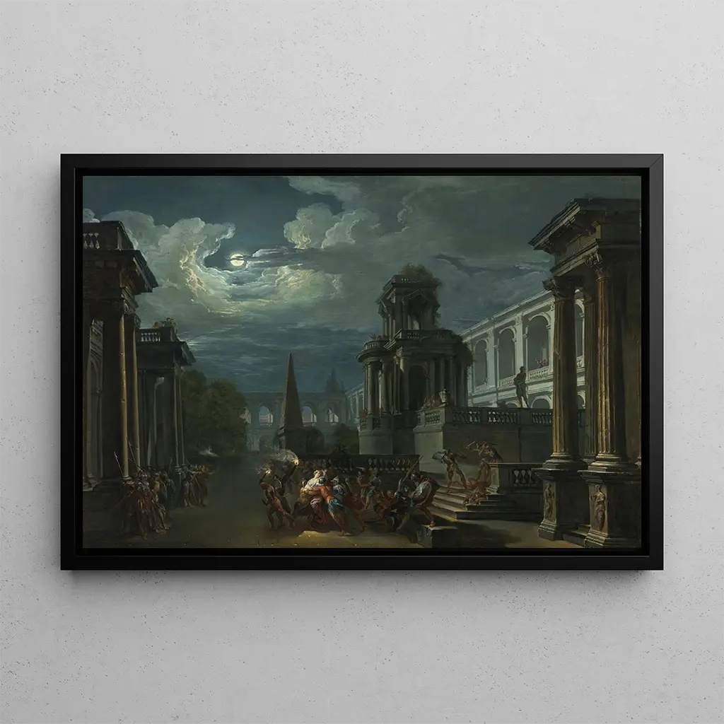 Helene's Ontvoering: een betoverend mythologisch drama "Helene's Ontvoering" van Giovanni Paolo Panini is een kunstwerk dat de essentie van het mythologische drama vastlegt. De scène, rijk aan beweging en emotie, beeldt het cruciale moment uit waarop Helene wordt ontvoerd door Parys, een gebeurtenis die de Trojaanse oorlog zal ontketenen. De levendige kleuren en de minutieuze details van de personages en de architectuur creëren een dynamische en boeiende sfeer. Panini's techniek, die barok en classicisme combineert, brengt deze mythologische vertelling tot leven en transporteert de kijker naar een wereld waarin het lot van de helden op het spel staat. Giovanni Paolo Panini: de kunstenaar van het grote verhaal Giovanni Paolo Panini, actief in de 18e eeuw, is vooral bekend om zijn landschappen en historische scènes. Zijn stijl, beïnvloed door het barok, kenmerkt zich door een grote rijkdom aan details en een zorgvuldig uitgebalanceerde compositie. Panini wist het collectieve verbeeldingsvermogen van zijn tijd vast te leggen door elementen uit de mythologie en de geschiedenis in zijn werken te integreren. "Helene's Ontvoering" is emblematisch voor zijn talent om verhalen te vertellen via kunst, terwijl het de culturele en sociale zorgen van zijn tijd weerspiegelt. Zijn nalatenschap blijft voortleven en inspireert generaties kunstenaars die volgen. Een decoratief stuk met vele voordelen De kunstdruk "Helene's Ontvoering" is een kunstwerk dat elke ruimte verrijkt, of het nu een woonkamer, kantoor of slaapkamer is. De kwaliteit van de afdruk en de trouw aan het originele werk maken van dit doek een ideale keuze voor wie een vleugje verfijning aan hun interieurdecoratie wil toevoegen. De esthetische aantrekkingskracht van dit werk ligt in zijn vermogen om emoties op te roepen en reflecties over het lot en de liefde te stimuleren. Door te kiezen voor deze kunstdruk investeert u in een stuk dat ongetwijfeld de aandacht zal trekken en uw omgeving zal verrijken.