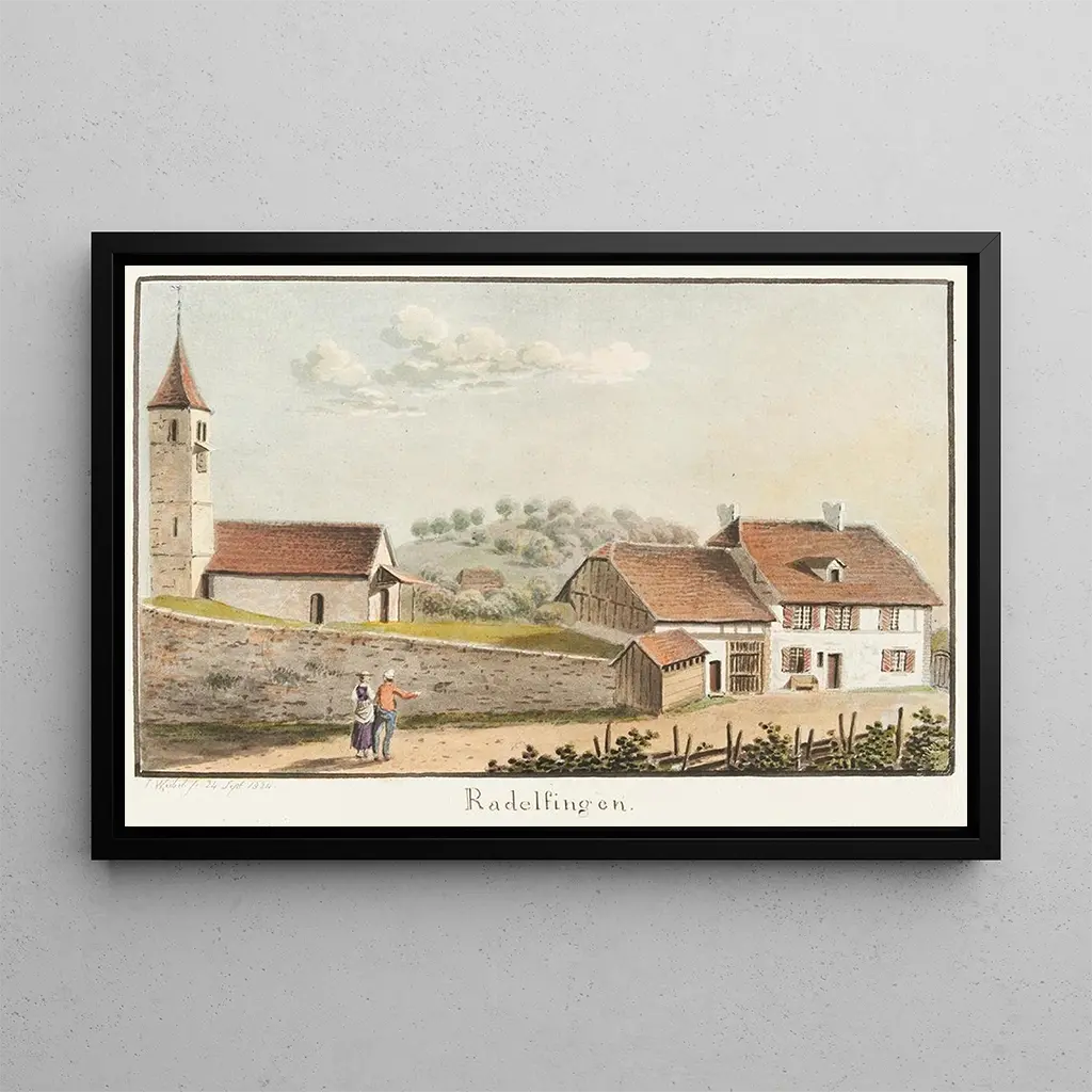 Radelfingen : een blik op het Zwitserse plattelandsleven De kunstdruk van "Radelfingen" dompelt ons onder in een Zwitsers plattelandslandschap waar natuur en architectuur harmonieus samenkomen. De aardetinten en de nuances van groen roepen de rijkdom van het platteland op, terwijl de minutieuze details van de gebouwen een historische dimensie aan de scène toevoegen. Jakob Samuel Weibel, met zijn realistische stijl, slaagt erin de essentie van het dagelijks leven in dit dorp vast te leggen en eert de schoonheid van het Zwitserse landschap. De rustige sfeer die van dit doek uitgaat, nodigt uit tot dromen en ontsnapping. Jakob Samuel Weibel : een getuige van zijn tijd Jakob Samuel Weibel, actief in de 19e eeuw, is een Zwitserse kunstenaar wiens werken de landelijke levensstijl van zijn tijd weerspiegelen. Geïnspireerd door het realisme, wist hij de landschappen en scènes van het dagelijks leven nauwkeurig weer te geven. Zijn doeken getuigen van een diep respect voor de natuur en de lokale cultuur, waardoor hij een belangrijke vertegenwoordiger van de Zwitserse kunst is. Hoewel hij minder bekend is dan sommige van zijn tijdgenoten, heeft Weibel een significante stempel gedrukt op de regionale kunst en momenten van eenvoud en schoonheid vastgelegd. Een decoratief stuk met vele voordelen De kunstdruk van "Radelfingen" is een decoratief stuk dat je interieur zal verrijken met zijn landelijke charme. Ideaal voor een woonkamer, kantoor of slaapkamer, brengt dit doek een vleugje authenticiteit en sereniteit in je ruimte. De kwaliteit van de kunstdruk garandeert een trouwheid aan de details en kleuren van het originele werk, terwijl het een onmiskenbare esthetische aantrekkingskracht biedt. Door voor dit werk te kiezen, kies je voor een decoratie die de schoonheid van het Zwitserse landschap oproept en zo een warme en gastvrije sfeer bij je thuis creëert.