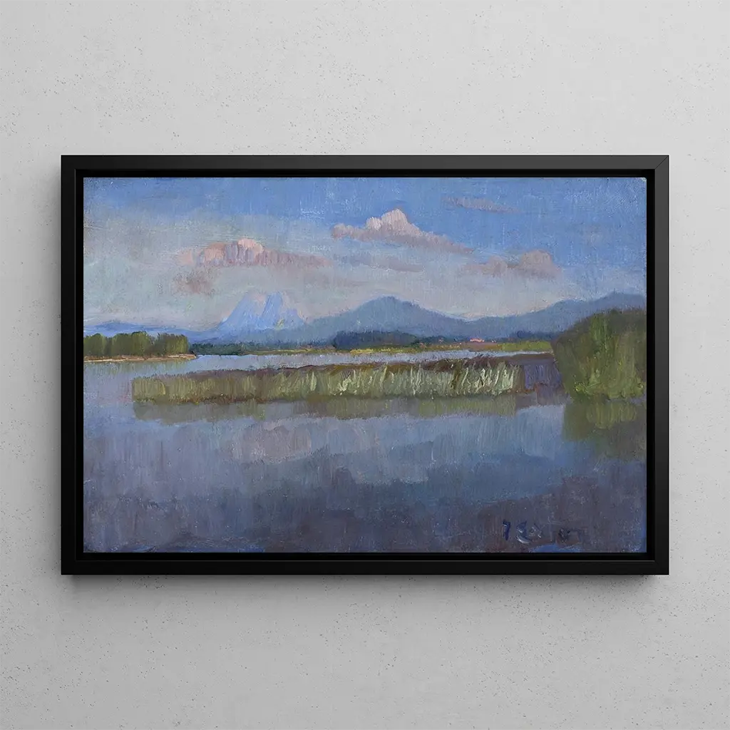 Rive du Chiemsee : een landschap doordrenkt met sereniteit "Rive du Chiemsee", een kunstdruk van Julius Exter, roept een rustgevende kalmte op door zijn tinten blauw en groen. Het schilderij vangt de schoonheid van een meer omgeven door majestueuze bergen, waar het licht zachtjes weerkaatst op het water. De harmonieuze compositie en het subtiele gebruik van kleuren creëren een dromerige sfeer, uitnodigend tot contemplatie. Exter, met zijn beheersing van licht en schaduw, slaagt erin een gevoel van vrede en ontsnapping over te brengen, waardoor dit kunstwerk een ware oase van sereniteit wordt. Julius Exter : een meester van het moderne landschap Julius Exter, een Duitse schilder uit het begin van de 20e eeuw, staat bekend om zijn betoverende landschappen die impressionisme en expressionisme combineren. Geïnspireerd door de omliggende natuur en de grote meesters van het landschap, ontwikkelde hij een unieke stijl, gekenmerkt door levendige kleuren en een persoonlijke toets. Exter heeft een groot deel van zijn carrière gewijd aan het afbeelden van de landschappen van zijn regio, met name het Chiemsee, een iconisch meer in Beieren. Zijn werk getuigt van een diepe verbondenheid met de natuur en een zoektocht naar schoonheid, waardoor hij een belangrijke figuur is in de moderne landschapskunst. Een decoratief stuk met vele voordelen Het kiezen van een kunstdruk van "Rive du Chiemsee" voor uw woonruimte is een verstandige keuze. Dit schilderij brengt een rustige en inspirerende sfeer in uw woonkamer, kantoor of slaapkamer. De kwaliteit van de kunstdruk garandeert een nauwkeurige weergave van de nuances en details van het originele werk, zodat u kunt genieten van de schoonheid van het landschap. Met zijn esthetische aantrekkingskracht wordt dit doek een centraal decoratief element dat bewondering oproept en een serene sfeer creëert, ideaal voor ontspanning en reflectie.