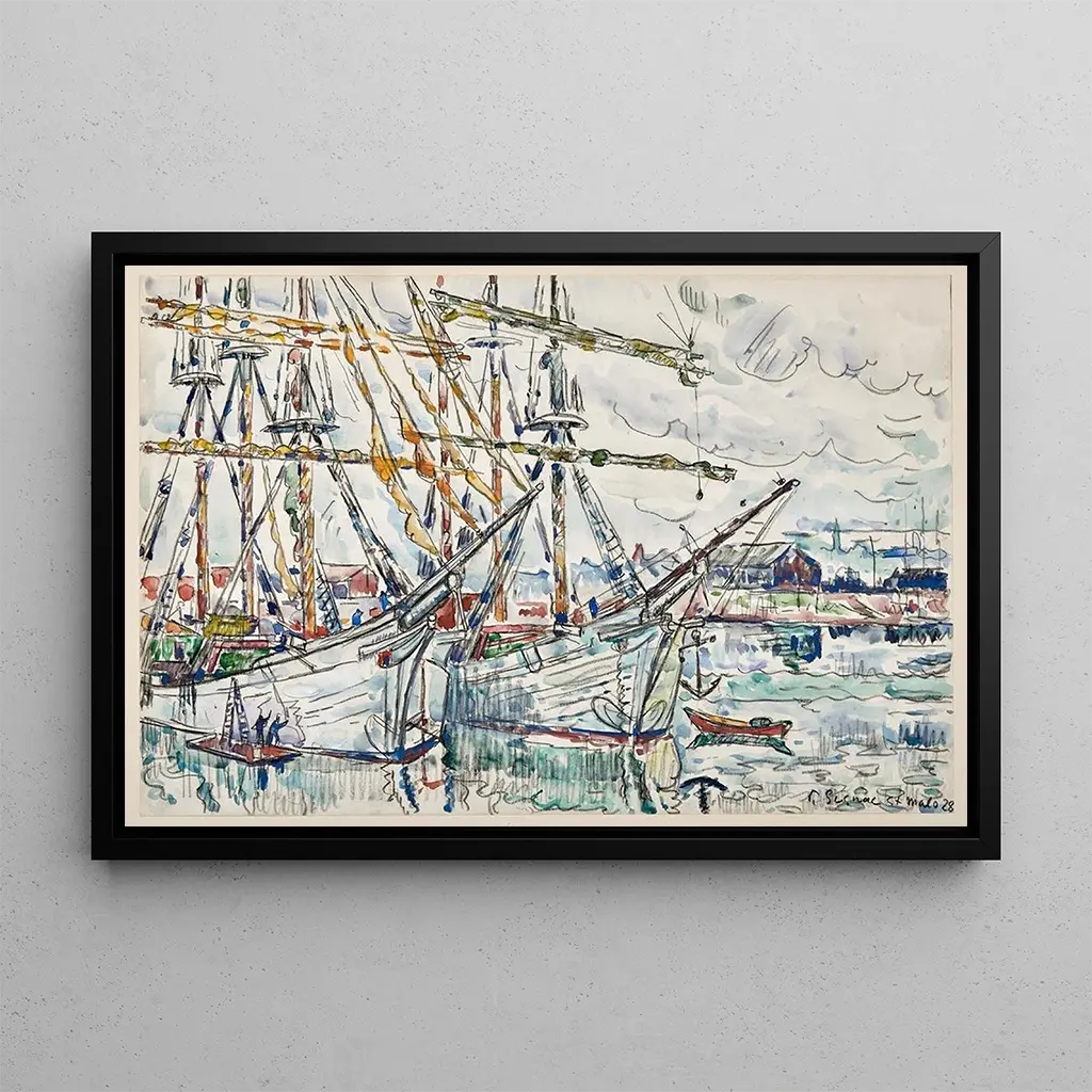 In deze kunstdruk van Saint-Malo Les Terre-Neuvas vangt Paul Signac de essentie van het maritieme leven. De levendige kleuren en de dynamische penseelstreken roepen de beweging van de golven en de energie van de zeelieden op. Het doek, rijk aan details, toont vissersboten in actie, terwijl de blauwe hemel zich mengt met witte accenten, wat een zonnige dag suggereert. De sfeer is zowel vrolijk als arbeidsintensief, en eert de visserijindustrie die de stad Saint-Malo heeft gevormd. Elk element van de compositie nodigt de kijker uit om de passie en toewijding van de zeevarenden te voelen.