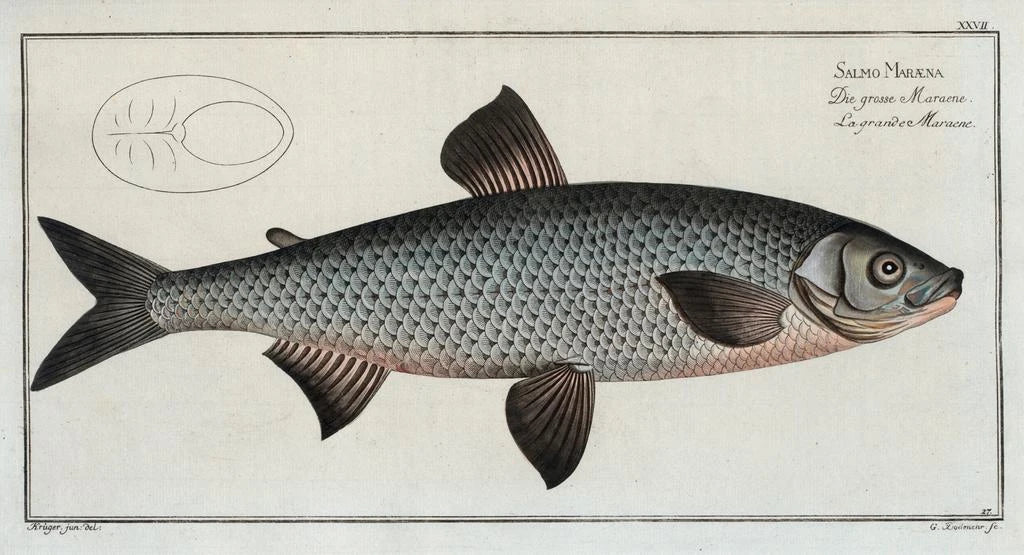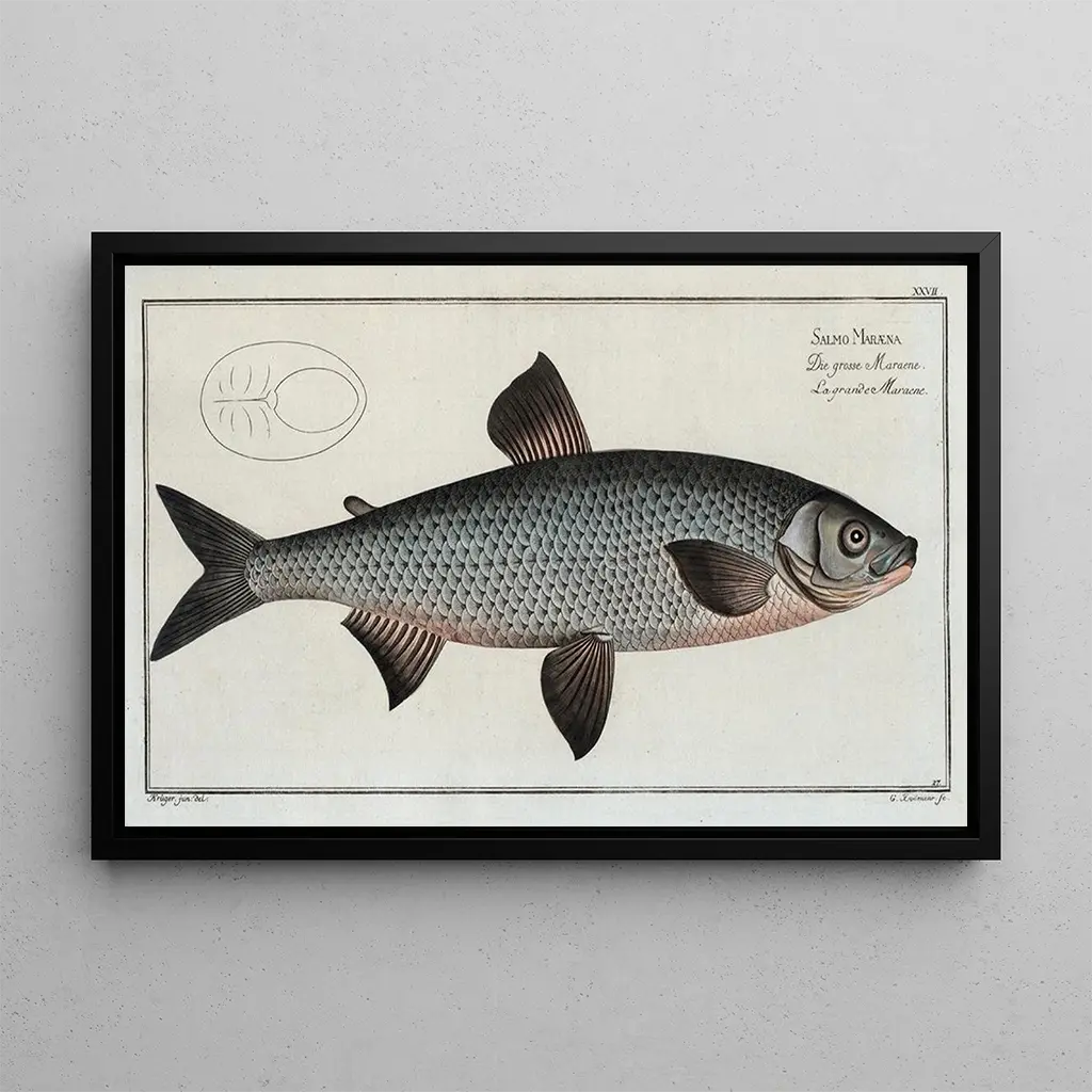Salmo Marna Le Grand Marna : een eerbetoon aan de waterfauna De kunstdruk "Salmo Marna Le Grand Marna" dompelt ons onder in de fascinerende wereld van het waterleven. Dit schilderij, ondertekend door Marcus Elieser Bloch, belicht de majestueuze zalm, symbool van kracht en schoonheid. De minutieuze details en de levendige kleuren van dit werk illustreren perfect de fijnheid van Blochs techniek, die aquarel en graveerkunst combineert. De sfeer die van dit doek uitgaat, is zowel dynamisch als rustgevend, en vangt de essentie van de waternatuur. Elke penseelstreek lijkt een verhaal te vertellen, dat van het onderwaterleven en zijn rijke en diverse ecosysteem. Marcus Elieser Bloch : pionier in de illustratie van de dierenwereld Marcus Elieser Bloch, natuurkundige en kunstenaar uit de 18e eeuw, is beroemd om zijn illustraties van vissen en andere zeedieren. Zijn werk, dat wetenschap en kunst verenigt, speelde een essentiële rol in de documentatie van de waterfauna van zijn tijd. Geïnspireerd door de wetenschappelijke ontdekkingen van zijn periode, wist Bloch de schoonheid en diversiteit van mariene soorten met opmerkelijke precisie vast te leggen. Zijn boek "Naturgeschichte der ausländischen Fische" wordt beschouwd als een referentie op het gebied van de ichthyologie. Dankzij zijn talent wist hij de interesse voor mariene biologie te wekken en heeft hij een blijvende erfenis achtergelaten in de dierenkunst. Een decoratief stuk met vele voordelen De kunstdruk van "Salmo Marna Le Grand Marna" is een ideaal decoratief stuk voor liefhebbers van natuur en waterleven. Of het nu in een kantoor, woonkamer of eetkamer is, dit doek brengt een vleugje elegantie en nieuwsgierigheid in uw interieur. De afdrukkwaliteit garandeert een uitzonderlijke fideliteit aan de details en de levendige kleuren van het originele werk, zodat u ten volle kunt genieten van de schoonheid van deze illustratie. Door te kiezen voor deze kunstdruk, kiest u voor een decoratie die esthetiek en passie voor de natuur combineert, en tegelijkertijd een eerbetoon brengt aan de kunst van Marcus Elieser Bloch.
