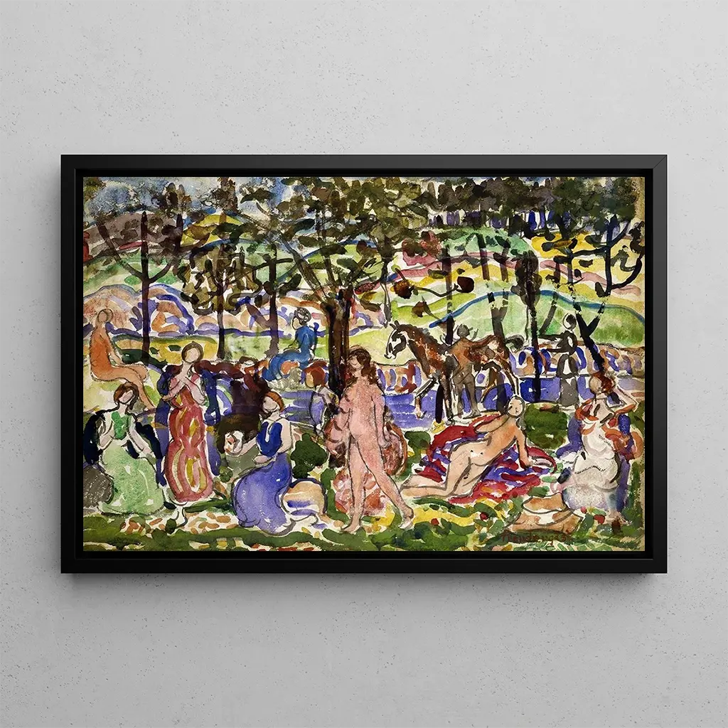 Parkscene: een idyllische ontsnapping in het hart van de natuur De kunstdruk van Parkscene van Maurice Prendergast roept een sfeer van rust en vreugde op. De levendige en heldere kleuren, typerend voor de kunstenaar, dompelen de kijker onder in een wereld waar natuur en menselijkheid harmonieus samenleven. De penseelstreken, licht aangebracht, creëren een vloeiende beweging, alsof de wind de bladeren van de bomen streelt. De personages, vaak afgebeeld in ontspannen poses, lijken te genieten van een moment van rust, uitnodigend tot contemplatie en ontsnapping. Dit doek, vol leven, vangt de essentie van een zonnige dag, waarop het park een ontmoetingsplek en een gedeeld plezier wordt. Maurice Prendergast: een pionier van het Amerikaanse post-impressionisme Maurice Prendergast, actief aan het einde van de 19e en het begin van de 20e eeuw, wordt erkend als een van de meesters van het Amerikaanse post-impressionisme. Geïnspireerd door Europese bewegingen, met name het fauvisme, ontwikkelt hij een unieke stijl, gekenmerkt door heldere kleuren en dynamische composities. Prendergast heeft vaak de thema's van het stadsleven en vrijetijdsbesteding verkend, en de geest van zijn tijd vastgelegd. Zijn werken, zoals Parkscene, getuigen van een gevoeligheid voor de schoonheid van eenvoudige momenten, terwijl ze tegelijkertijd de sociale en culturele veranderingen van zijn tijd weerspiegelen. Zijn nalatenschap blijft inspireren en beïnvloedt vele hedendaagse kunstenaars. Een decoratief stuk met vele voordelen De kunstdruk van Parkscene is een ideaal decoratief stuk om een vleugje frisheid en kleur aan uw interieur toe te voegen. Of het nu in een woonkamer, kantoor of slaapkamer is, dit doek trekt de aandacht en wekt positieve emoties op. De afdrukkwaliteit garandeert een opmerkelijke fideliteit aan de details en de originele kleuren, zodat u volop kunt genieten van het werk van Prendergast. Met zijn esthetische aantrekkingskracht past deze kunstdruk harmonieus in diverse decoratiestijlen, van modern tot klassiek, en is het een slimme keuze om uw leefruimte te verrijken.