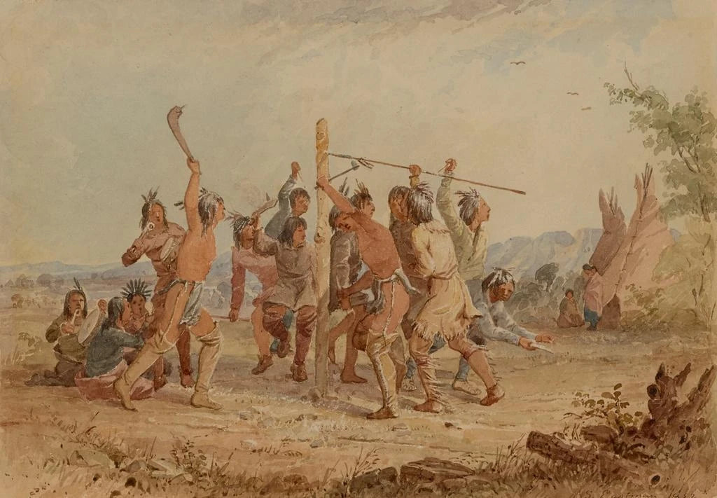 Het werk "Klop op de paal" van Seth Eastman vangt een dynamisch moment waarin kracht en vastberadenheid samenkomen. De aardetinten en de nuances van blauw roepen een sfeer op die zowel realistisch als levendig is. De techniek van de kunstenaar, die behendig aquarel en olieverf combineert, brengt de scène tot leven en stelt de kijker in staat de energie te voelen die uit de personages straalt. Elk detail, van gezichtsuitdrukkingen tot de bewegingen van de lichamen, is zorgvuldig weergegeven, wat een volledige onderdompeling in dit moment uit de geschiedenis mogelijk maakt.