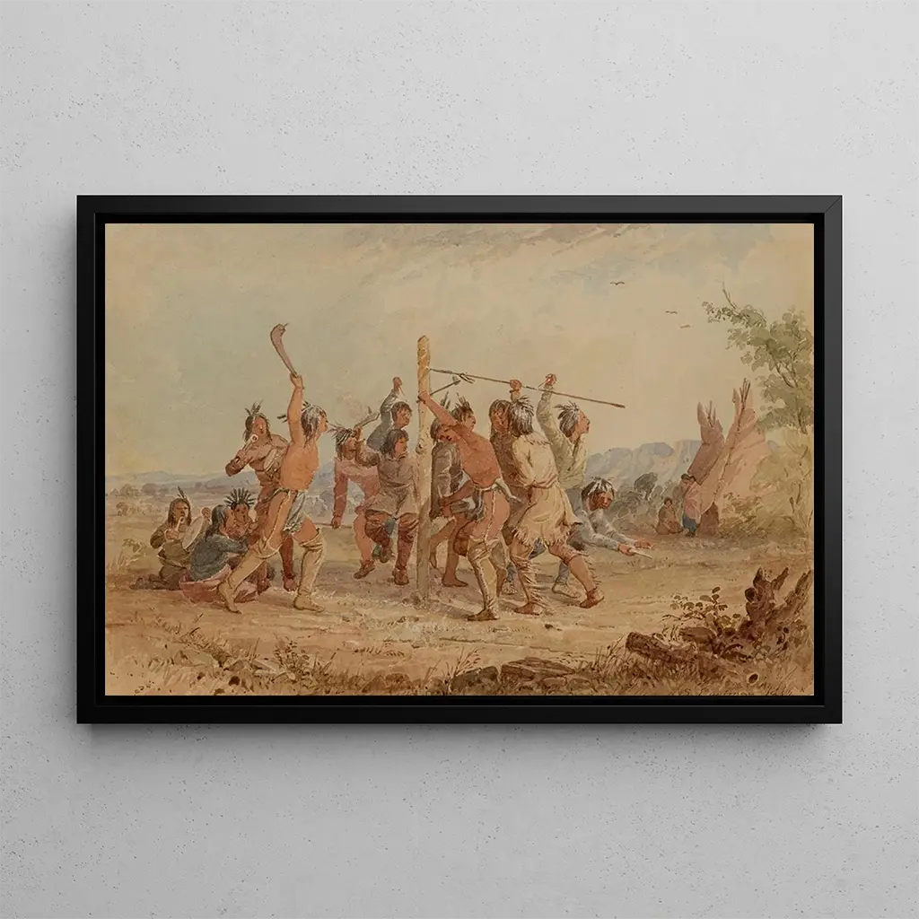 Seth Eastman, geboren in 1808, is een Amerikaanse kunstenaar die bekend staat om zijn weergaven van het leven en de landschappen van inheemse volkeren. Actief in een periode waarin de uitbreiding naar het westen het Amerikaanse culturele landschap herdefinieerde, werd Eastman beïnvloed door zijn reizen en interacties met de inheemse stammen. Zijn stijl, geworteld in het realisme, getuigt van een wens om het dagelijks leven en de tradities van de volkeren die hij heeft ontmoet te documenteren. Zijn kunstwerk "Klop op de paal" past binnen deze aanpak en biedt een waardevol inzicht in de tijd en de culturen die hij probeerde te vertegenwoordigen.