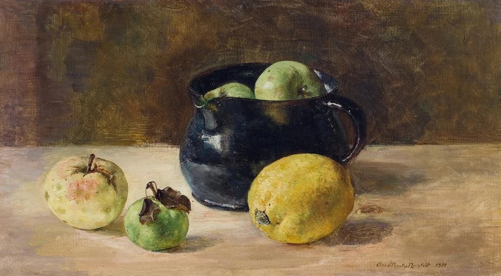 De kunstdruk van Natuurstudie door Anna Munthe-Norstedt roept een tijdloze sereniteit op door middel van een zorgvuldig gecomponeerde samenstelling. De alledaagse voorwerpen, zoals fruit en bloemen, zijn met een delicate touch geplaatst die hun vormen en kleuren benadrukt. De zachte tinten en het spel van licht creëren een warme sfeer die uitnodigt tot contemplatie. Munthe-Norstedt slaagt erin om gewone elementen om te toveren tot een ware viering van de schoonheid van het dagelijks leven, waar elk detail telt en een verhaal vertelt.