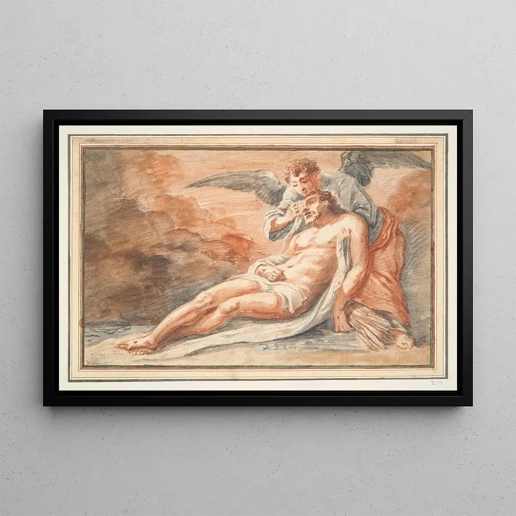 La kunstdruk de l'œuvre "Ange réconfortant le Christ déposé" nous transporte dans un moment de profonde émotion et de sérénité. Cette toile anonyme, d'une beauté saisissante, représente un ange veillant sur le corps du Christ, symbolisant la compassion et l'espoir au sein de la souffrance. Les couleurs douces et les lumières délicates créent une atmosphère apaisante, tandis que la technique de l'artiste, bien que moins identifiable, témoigne d'une maîtrise des formes et des expressions. Chaque détail, des ailes de l'ange aux traits du Christ, est soigneusement travaillé, invitant le spectateur à ressentir la tendresse de cette scène sacrée.