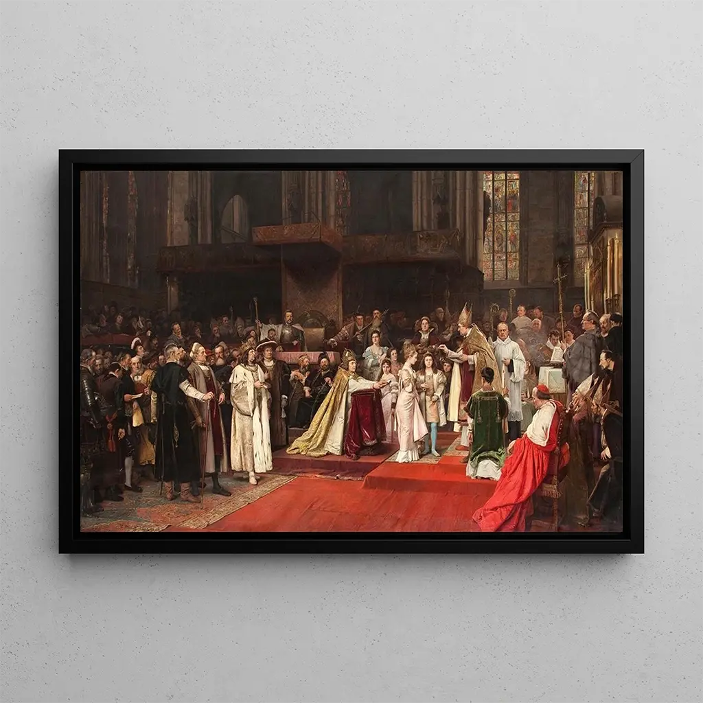 De kunstdruk van Tu felix Austria nube van Václav Brožík roept een sfeer op van sereniteit en pracht. Dit werk, rijk aan details, toont een scène waarin het zachte licht de gezichten van de personages streelt, waardoor een boeiend spel van schaduwen en licht ontstaat. De pastelkleuren, die tinten van blauw, roze en goud combineren, brengen een vleugje verfijning en droomachtigheid. De olieverftechniek, beheerst door Brožík, maakt een opmerkelijke fijnheid mogelijk in het weergeven van texturen en uitdrukkingen. Elk element van het doek lijkt een verhaal te vertellen, en nodigt de kijker uit om onder te dompelen in een wereld van vrede en verfijning.