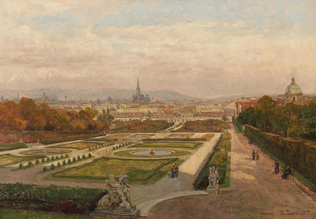 Hugo Darnaut, Oostenrijkse schilder actief in het begin van de 20e eeuw, staat bekend om zijn weergaven van stedelijke landschappen en scènes uit het dagelijks leven. Evoluerend in een periode van architectonische transformatie in Wenen, wist hij de essentie van zijn stad vast te leggen met een blik die zowel nostalgisch als modern is. Geïnspireerd door de impressionistische beweging, ontwikkelde Darnaut een stijl die licht en kleur combineert, en zo de stedelijkheid van zijn tijd eert. Zijn werken zijn waardevolle getuigenissen van de evolutie van Wenen, die zowel haar geschiedenis als haar dynamiek weerspiegelen.