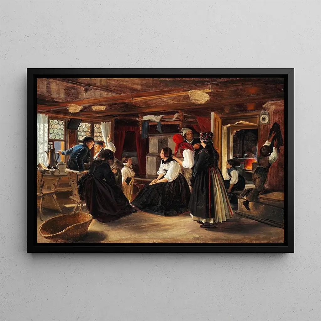 De kunstdruk van Voorbereidingen voor het huwelijk door Hermann Sondermann beeldt op delicate wijze de intimiteit uit van een kantelmoment. Dit doek, doordrenkt met zachte kleuren en warme lichten, toont een scène van voorbereiding waarin emotie en anticipatie samenkomen. De personages, zorgvuldig geplaatst, lijken gevangen in een stille dans, elk verdiept in zijn gedachten en bewegingen. De techniek van Sondermann, die realisme combineert met impressionistische accenten, creëert een sfeer die zowel feestelijk als contemplatief is, en nodigt de kijker uit om de magie van liefde en betrokkenheid te voelen.