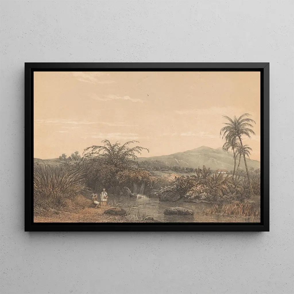 De "Vue sur Tjileboet" van Johan Conrad Greive brengt de kijker naar het hart van een weelderig Indonesisch landschap. Dit schilderij, rijk aan details, beeldt een scène uit waarin de natuur in al haar pracht bloeit. De levendige groene tinten van de bladeren mengen zich met de zachte nuances van de lucht, waardoor een sfeer van vrede en harmonie ontstaat. De techniek van Greive, die realisme combineert met impressionistische accenten, laat de warmte en vochtigheid van deze idyllische plek voelen. Dit kunstwerk nodigt uit tot een zintuiglijke ontsnapping, waarbij elke blik een nieuw facet van dit betoverende landschap onthult.