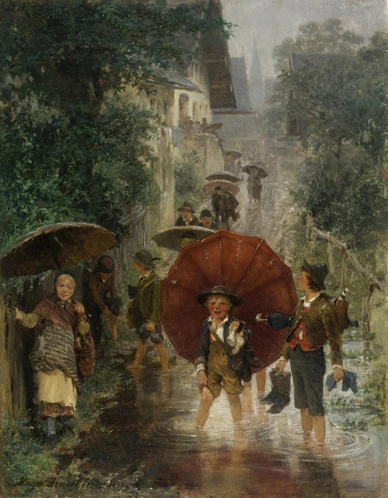 Na schooltijd, de kinderen in de regen - Hugo Kauffmann
