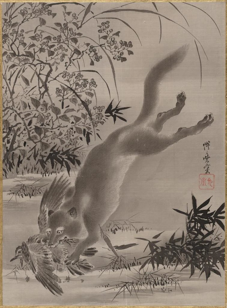 Renard dat een vogel vangt - Kawanabe Kyōsai