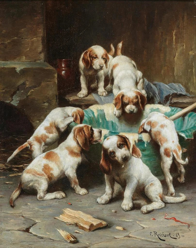 Carl Reichert, meester in detail en beweging, slaagt erin om zijn onderwerpen een ongelooflijk leven te geven. In "Chiots Beagle aan het genieten" is elk haar van de dieren minutieus geschilderd, waardoor een bijna tastbare textuur ontstaat. De compositie is zorgvuldig in balans, de puppy's verstrengeld in een dans van nieuwsgierigheid en spel, terwijl de kleuren, zowel levendig als harmonieus, de vrolijke sfeer van de scène versterken. Dit realisme, kenmerkend voor Reicherts stijl, gaat veel verder dan eenvoudige voorstelling: het roept een emotie op, een jeugdherinnering, een nostalgie naar eenvoudige maar waardevolle momenten. De manier waarop hij het moment vastlegt, met bijzondere aandacht voor de uitdrukkingen van de puppy's, getuigt van zijn uitzonderlijk talent als kunstenaar.