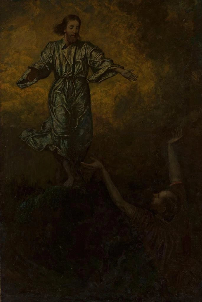 Hans Thoma, né en 1839, est reconnu comme l'un des grands maîtres du symbolisme allemand. Sa carrière a été façonnée par des influences variées, allant du romantisme à l'impressionnisme, ce qui lui a permis de développer un style distinctif. Thoma a souvent puisé son inspiration dans la nature et la spiritualité, cherchant à exprimer des thèmes universels à travers ses œuvres. "Christ et Saint Pierre" témoigne de son engagement envers la représentation de la foi et des valeurs humaines, tout en s'inscrivant dans une époque où l'art religieux connaissait une renaissance.