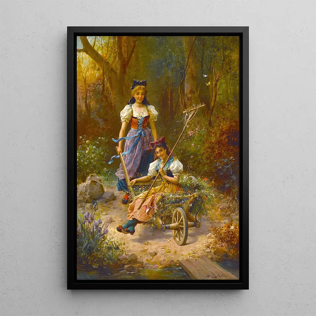 Hans Zatzka, actief aan het einde van de 19e en het begin van de 20e eeuw, is een Oostenrijkse kunstschilder wiens stijl wordt gekenmerkt door een delicate romantiek en een gevoeligheid voor de schoonheid van de natuur. Geïnspireerd door de symbolistische beweging, wist Zatzka momenten van geluk en lichtheid vast te leggen in zijn werken. Zijn carrière, gekenmerkt door een constante zoektocht naar harmonie, maakte hem tot een iconische figuur van de Weense kunst. Zijn schilderijen, vaak bevolkt door geïdealiseerde personages, getuigen van een tijd waarin kunst werd gezien als een middel tot ontsnapping aan de tumulten van het moderne leven.