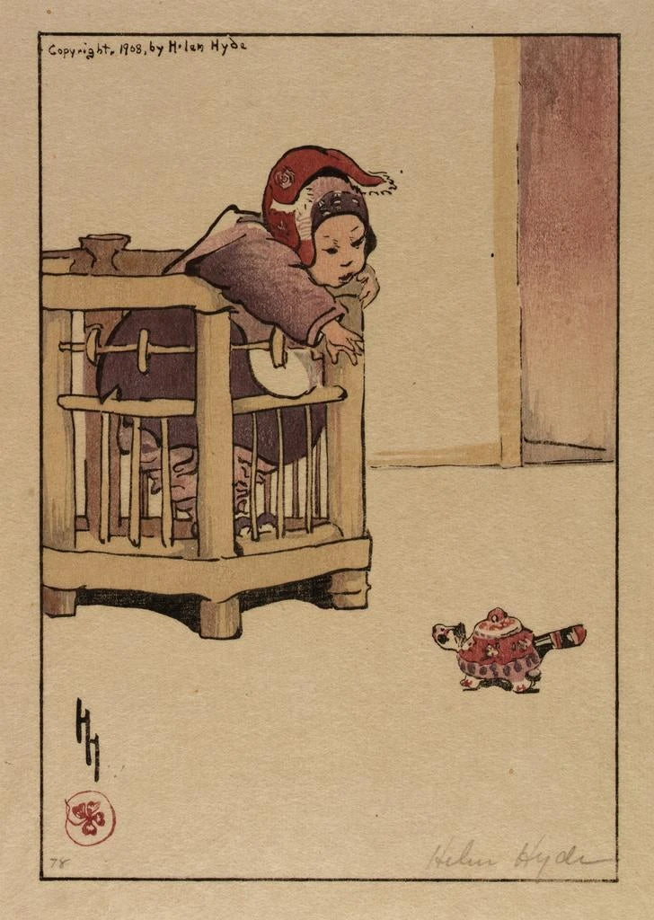 Helen Hyde, Amerikaanse kunstenares van het begin van de 20e eeuw, staat bekend om haar werken geïnspireerd door de Japanse cultuur. Geboren in 1868, bracht ze een deel van haar leven door in Japan, waar ze diep werd beïnvloed door de esthetiek en artistieke tradities van het land. Haar stijl, gekenmerkt door bloemmotieven en scènes uit het dagelijks leven, weerspiegelt een unieke fusie tussen Oost en West. Mademoiselle Nuage d'abricot maakt deel uit van deze periode in haar oeuvre waarin ze de vrouwelijkheid en schoonheid verkent via delicate en poëtische voorstellingen, waarmee ze haar stempel drukt op de kunstgeschiedenis.