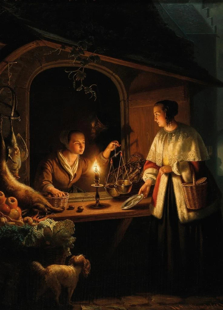 De kunstdruk "Een nachtmarkt" van Henri de Braekeleer dompelt ons onder in een levendige en bruisende scène, waar de fonkelende lichten van de kraampjes de nacht verlichten. Dit schilderij, rijk aan details, vangt de energie en de bedrijvigheid van een nachtmarkt, waar felle kleuren zich mengen met schaduwen en een opvallend contrast creëren. De personages, betrokken bij hun transacties, voegen dynamiek toe aan het werk, terwijl de algemene sfeer een warme gezelligheid uitstraalt. De beheersing van het licht door Braekeleer brengt deze scène tot leven en nodigt de kijker uit om de animatie van dit bevroren moment in de tijd te voelen.