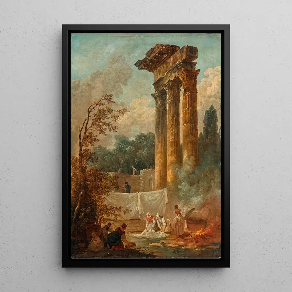 Lavandières : een levendig schilderij van het landelijke leven In "Lavandières" dompelt Hubert Robert ons onder in een idyllisch tafereel waar vrouwen zich bezighouden aan de rand van een rivier. De compositie is rijk aan details, met zachte kleuren die de lichtval van de dag door de bomen suggereren. De lavandières, gekleed in kleurrijke jurken, worden omringd door groene landschappen, wat een rustige en sereen sfeer creëert. De techniek van Robert, gekenmerkt door vloeiende penseelstreken en een bijzondere aandacht voor de weerspiegelingen in het water, brengt deze scène tot leven en nodigt de kijker uit om de frisheid van de lucht en het geruis van de rivier te voelen. Hubert Robert : een meester van het landschap in de achttiende eeuw Hubert Robert, geboren in 1733, is een Franse kunstschilder die bekend staat om zijn landschappen en voorstellingen van antieke ruïnes. Hij werkte in een periode waarin neoclassicisme en romantiek begonnen invloed uit te oefenen op de kunst. Robert wist de schoonheid van de natuur vast te leggen terwijl hij architectonische elementen integreerde. Zijn werk werd beïnvloed door reizen in Italië, waar hij inspiratie opdeed bij de Romeinse ruïnes. Als hofkunstenaar droeg hij ook bij aan de decoratie van de tuinen van Versailles, wat zijn status in de kunstwereld versterkte. Zijn vermogen om natuur en architectuur te combineren, heeft een blijvende erfenis achtergelaten in het Franse kunstlandschap. Een decoratief kunstdruk met vele voordelen De kunstdruk van "Lavandières" is een ideaal decoratief stuk om een vleugje rust in uw interieur te brengen. Of het nu in een woonkamer, kantoor of slaapkamer is, dit doek roept een sfeer van rust en eenvoud op. De kwaliteit van de kunstdruk garandeert een goede weergave van de kleuren en details van het originele werk, zodat u het talent van Hubert Robert volledig kunt waarderen. Met zijn esthetische aantrekkingskracht nodigt dit kunstwerk uit tot contemplatie en ontsnapping, en is het een perfecte keuze om uw interieurdecoratie te verrijken.