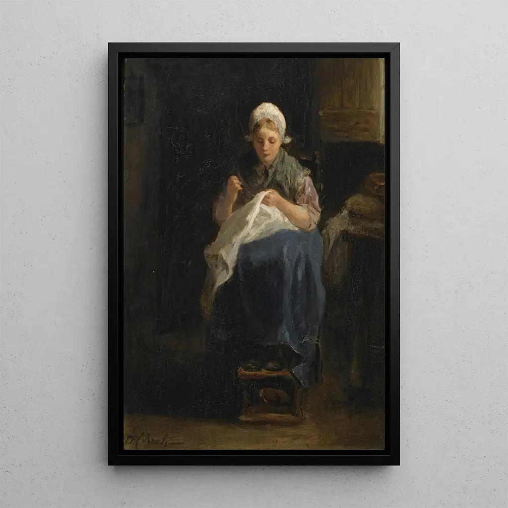 De kunstdruk van Een boerendochter die naait door Jozef Israëls beeldt met tederheid de eenvoud en schoonheid van het dagelijks leven uit. De compositie benadrukt een vrouw die verdiept is in haar werk, omringd door een landelijke omgeving die de rust van de velden oproept. De aardetinten, gedomineerd door bruin en groen, versterken de authenticiteit van de scène. De olieverftechniek op doek maakt het mogelijk om de texturen van de stoffen en het natuurlijke licht dat de kamer binnenstroomt vast te leggen, waardoor een warme en intieme sfeer ontstaat. Dit kunstwerk nodigt uit tot reflectie over arbeid en de waardigheid van vrouwen in de landelijke samenleving van de 19e eeuw.