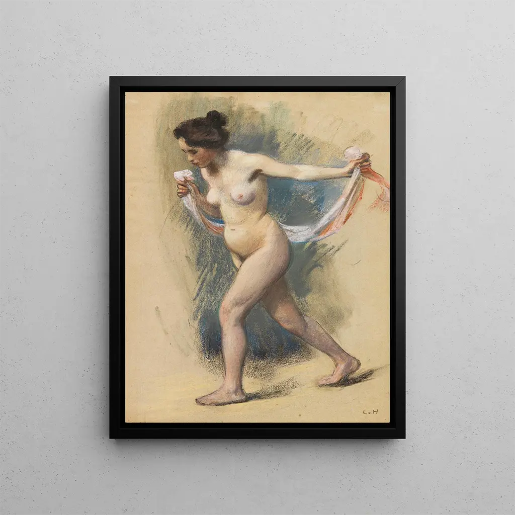 De stijl van Ludwig von Hofmann onderscheidt zich door zijn symbolistische benadering, waarin sensualiteit en erotiek verweven zijn met een palet van levendige kleuren. In "Danseuse avec voile" is de vrouwelijke figuur, tegelijk delicaat en krachtig, omhuld door een sluier die lijkt te zweven, wat een sfeer van mysterie en droom creëert. De sierlijke curves van de danseres, benadrukt door nuances van blauw en roze, roepen een gevoel van voortdurende beweging op, alsof ze op het punt staat zich uit de doek te lanceren. Dit spel van licht en schaduw, evenals de harmonieuze compositie, getuigt van de virtuositeit van de kunstenaar. Dansen is hier zowel een scheppingsdaad als een uitdrukking van de ziel, een uitnodiging om de schoonheid van het huidige moment te voelen.