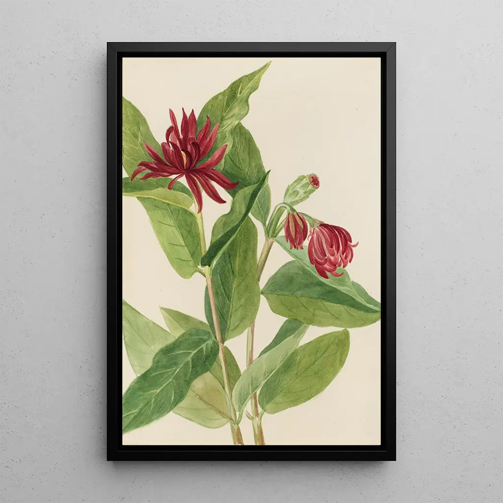 De kunstdruk van de Calycanthe occidental, vervaardigd door Mary Vaux Walcott, vangt de delicate schoonheid van deze plant. De nuances van groen en crème verweven zich harmonieus, terwijl de bloemblaadjes, van een zuiver wit, lijken te dansen onder het licht. De aquareltechniek maakt het mogelijk om de transparantie en lichtheid van elke bloem weer te geven, waardoor een rustgevende en contemplatieve sfeer ontstaat. De kunstenaar slaagt erin een gevoel van sereniteit over te brengen, waardoor de kijker wordt uitgenodigd om onder te dompelen in een rijke en levendige bloemenwereld.