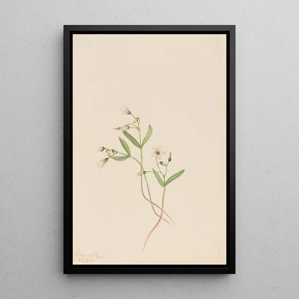 De kunstdruk van de Claytonie de printemps, of Claytonia lanceolata, roept een lentefeest op waarin de zachtheid van pastelkleuren verweven is met de frisheid van de bladeren. De nuances van zachte groen en lichtroze combineren harmonieus, waardoor een rustgevende en verkwikkende sfeer ontstaat. De aquareltechniek, gebruikt door Mary Vaux Walcott, maakt het mogelijk om de lichtheid en transparantie van de bloemblaadjes vast te leggen, waardoor deze delicate plant tot leven komt. Elk detail, van de nerven van de bladeren tot de subtiele schaduwen, nodigt uit tot een aandachtige en respectvolle contemplatie van de natuurlijke schoonheid.