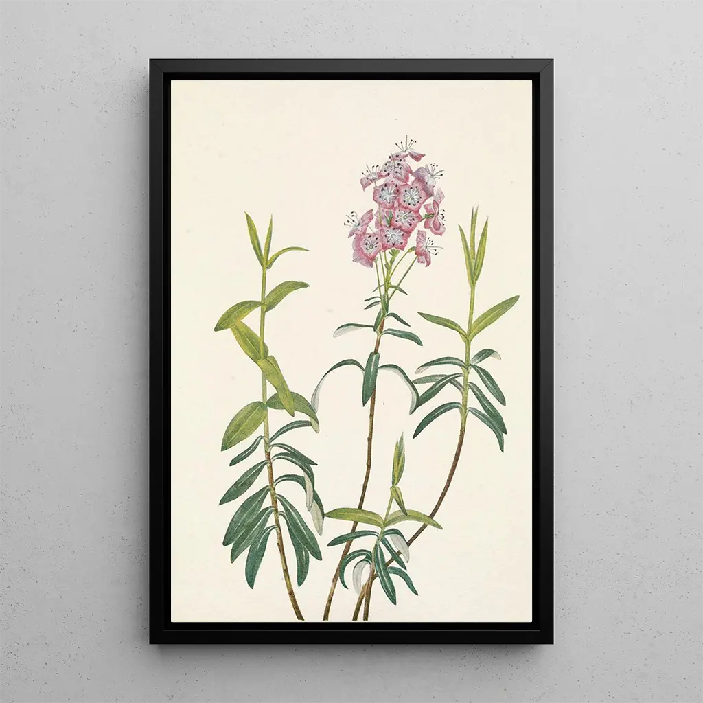 De kunstdruk van de Kalmia des marais, of Kalmia polifolia, dompelt ons onder in een delicat bloemrijk universum. Met zijn pastelkleuren variërend van zacht roze tot stralend wit, roept dit kunstwerk de zachtheid van vochtige weilanden op. De minutieuze details van de bloemblaadjes, weergegeven met aquareltechniek, creëren een sfeer van sereniteit. Elke penseelstreek lijkt het licht vast te leggen dat danst op de bloemen, uitnodigend tot een rustige contemplatie. Dit doek, zowel realistisch als poëtisch, herinnert ons aan de fragiele schoonheid van de natuur.