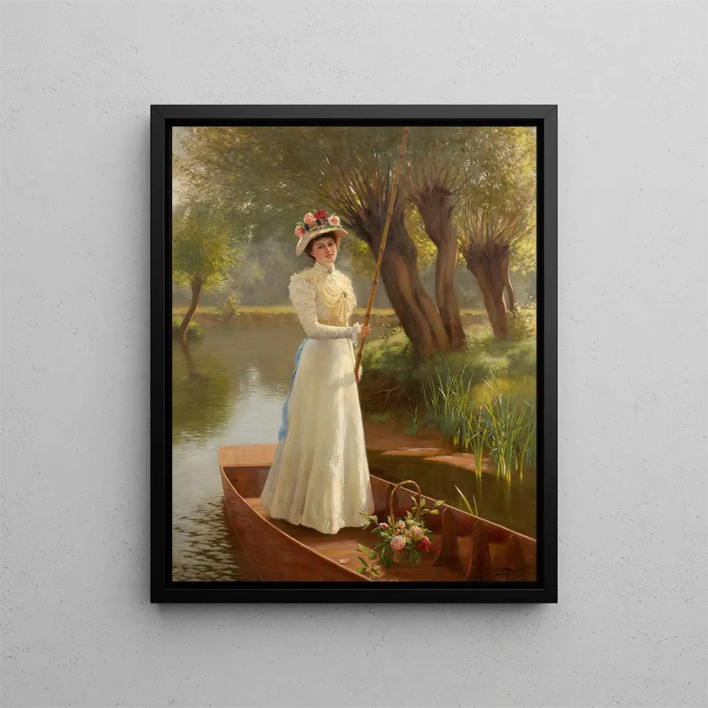 Reproductie Promenade en barque sur la Tamise - Frank Percy Wild – Boeiende introductie In de fascinerende wereld van de kunst slagen sommige werken erin de essentie van een moment, een emotie, een landschap vast te leggen. "Promenade en barque sur la Tamise - Frank Percy Wild" is een van die creaties die de kijker meeneemt naar de natuurlijke schoonheid en de rust van een middag op de beroemde rivier de Londense stad. Dit werk, doordrenkt met sereniteit, roept zowel de zachtheid van het leven als de harmonie tussen mens en natuur op. Bij het bekijken van deze scène voelt men bijna de lichte beweging van het water en de streling van een zachte bries, een uitnodiging om te ontsnappen aan de drukte van alledag en zich onder te dompelen in een wereld van gratie en poëzie. Stijl en uniekheid van het werk Het werk van Frank Percy Wild onderscheidt zich door zijn meesterlijke gebruik van licht en kleur. In "Promenade en barque sur la Tamise" mengen de subtiele tinten blauw en groen zich tot een rustgevende sfeer, waarin de reflecties van het licht in het water lijken te dansen onder invloed van de wind. De minutieuze details van de personages, de bomen en de gebouwen langs de rivier getuigen van een nauwkeurige observatie van de natuurlijke wereld. Wild slaagt erin elk element van de compositie tot leven te brengen, waardoor het schilderij zowel levendig als tijdloos is. Deze aandacht voor details, gecombineerd met een palet van harmonieuze kleuren, geeft het werk een emotionele diepgang die resoneert met iedereen die de tijd neemt om het te bewonderen. De kunstenaar en zijn invloed Frank Percy Wild, Britse schilder uit de 19e eeuw, wist zich te vestigen als een van de meesters van landschapsschilderkunst. Geïnspireerd door de grote artistieke stromingen van zijn tijd, ontwikkelde hij een unieke stijl die realisme en impressionisme combineert. Zijn passie voor de natuur en zijn verlangen om de vergankelijke schoonheid van landschappen vast te leggen, brachten hem ertoe verschillende omgevingen te verkennen, maar het is zonder twijfel de Tamise die zijn werk het meest heeft geïnspireerd. Door deze iconische rivier te vertegenwoordigen, beperkt Wild zich niet tot het schilderen van een eenvoudig panorama; hij weet herinneringen, gevoelens en een sfeer op te roepen die de tijd overstijgt. Zijn nalatenschap blijft voortbestaan, beïnvloedt vele