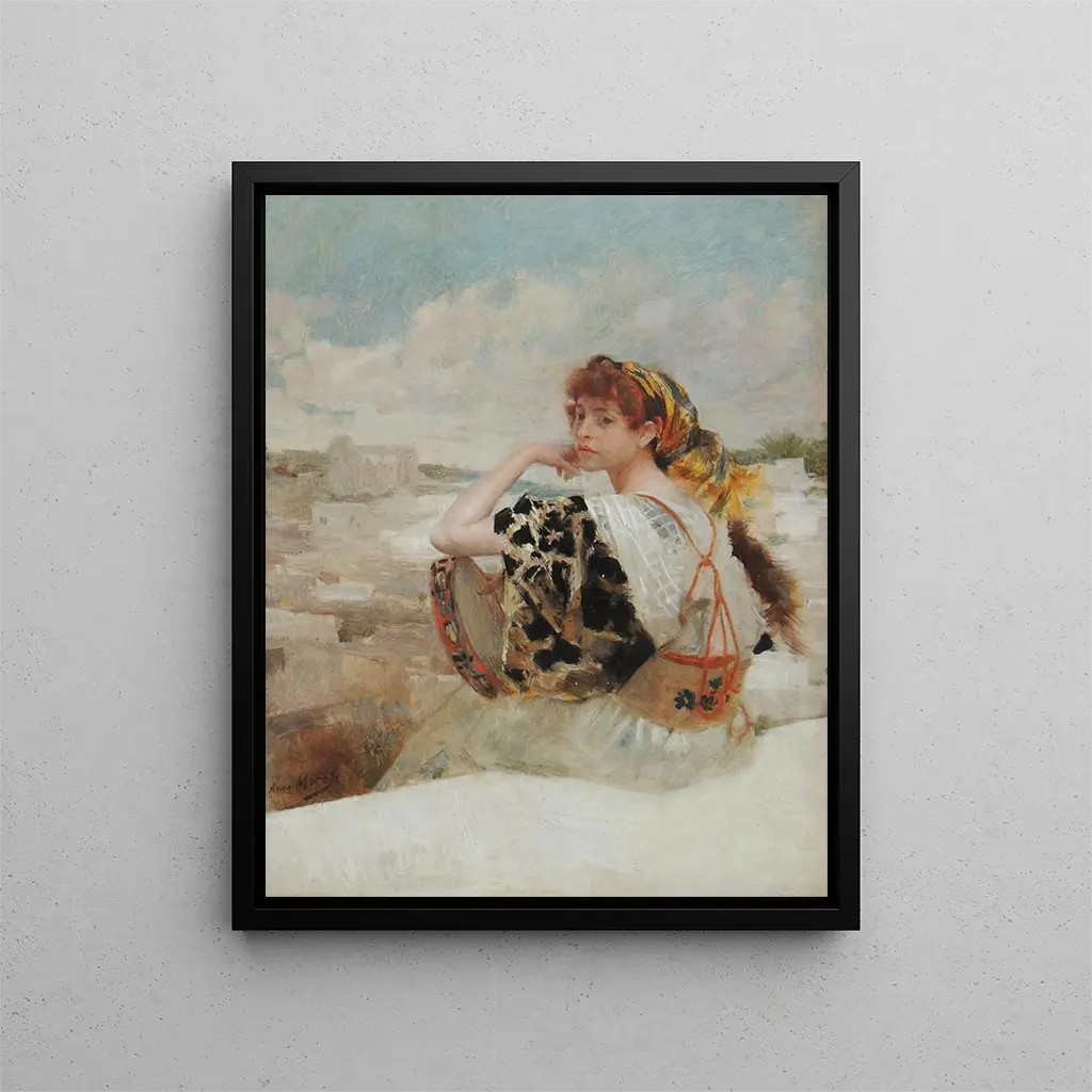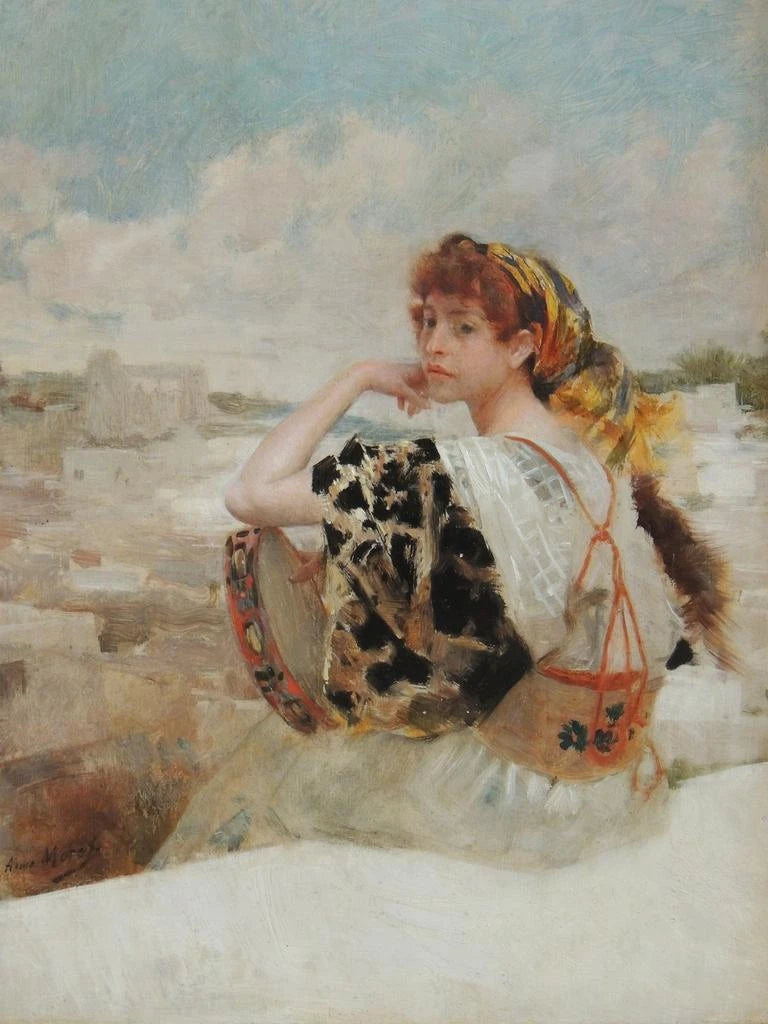 Aimé Morot, geboren in 1850, was een Franse schilder wiens werken vaak werden gekenmerkt door een bijzondere gevoeligheid voor alledaagse thema's en iconische personages. Als leerling van de École des beaux-arts in Parijs, vestigde hij zich snel als een gerenommeerde kunstenaar, won de Prix de Rome en exposeerde zijn werken op de Salon. Zijn fascinatie voor de zigeunercultuur, net als voor andere populaire onderwerpen uit zijn tijd, getuigt van een wens om de menselijke diversiteit en rauwe emotie vast te leggen. Morot wist vele hedendaagse kunstenaars te beïnvloeden, vooral door zijn benadering van licht en kleur, en zijn vermogen om verhalen te vertellen via portretten. "Gitane" vertegenwoordigt zo niet alleen een mijlpaal in zijn carrière, maar ook een reflectie van de artistieke zorgen van zijn tijd.