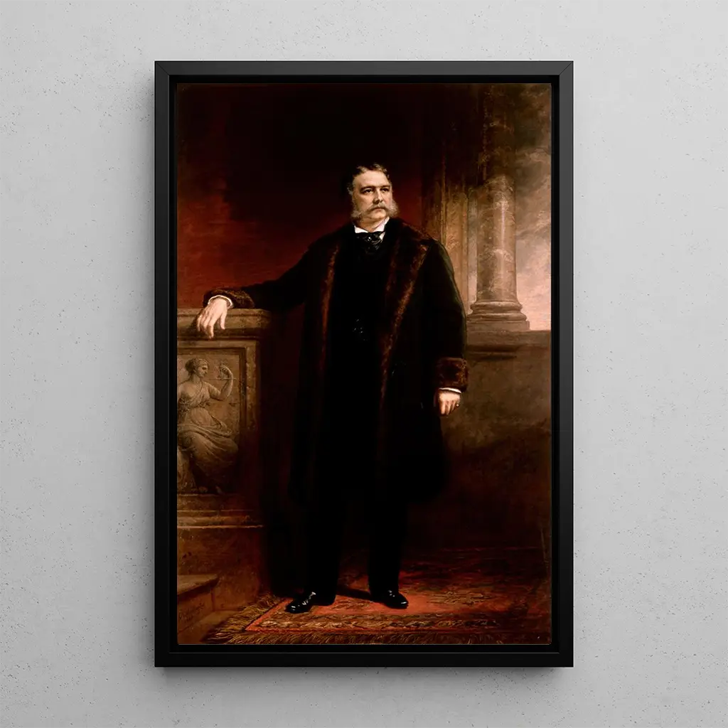 De kunstdruk van Chester Alan Arthur, vervaardigd door Daniel Huntington, vangt de essentie van een man wiens bedachtzame blik en zelfverzekerde houding getuigen van zijn rol als president van de Verenigde Staten. De warme kleuren, die nuances van bruin en goud mengen, creëren een sfeer die zowel plechtig als uitnodigend is. De techniek van Huntington, die realisme combineert met fijnheid in details, maakt het mogelijk om de karakteristieke trekken van Arthur vast te leggen, terwijl het een psychologische diepgang oproept. Dit schilderij, door zijn subtiele belichting en evenwichtige compositie, nodigt uit tot een aandachtige contemplatie en onthult de vele facetten van het complexe politieke persoon.