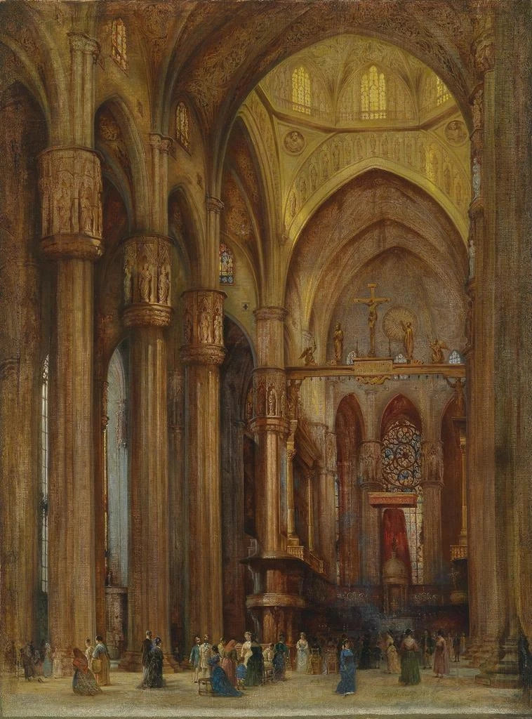 Franz Alt, geboren in 1815, is een schilder wiens werk de 19e eeuw heeft beïnvloed. Opgevoed in een artistieke omgeving, ontwikkelde hij een stijl die realisme en romantiek combineert. Zijn passie voor architectuur en natuur komt tot uiting in zijn schilderijen, waarin elk detail zorgvuldig wordt bestudeerd en gereconstrueerd. Alt werd ook beïnvloed door de grote meesters van het landschapsschilderen, maar hij wist een eigen identiteit te vormen door de specificiteiten van de plaatsen die hij afbeeldde te benadrukken. De kathedraal van Milaan, als symbool van