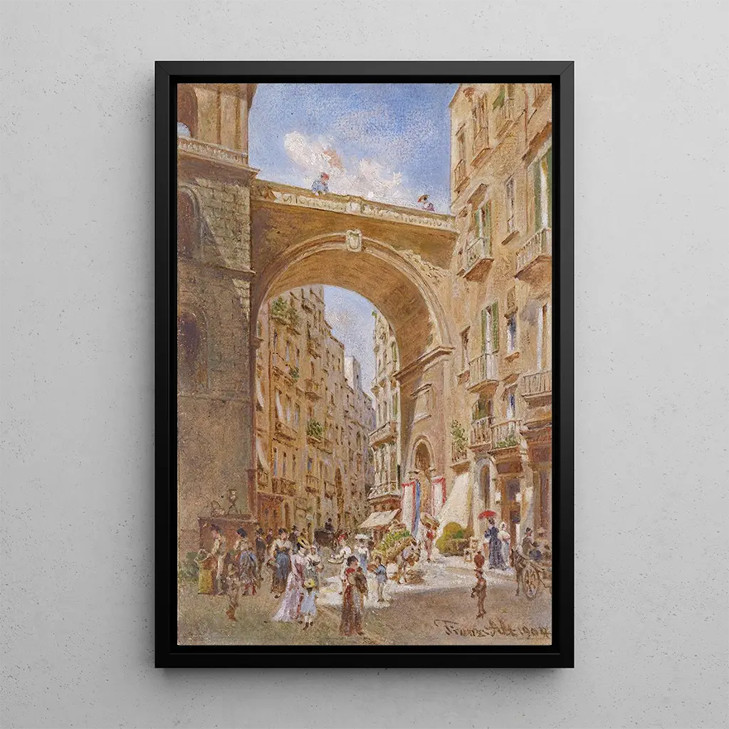 Franz Alt, Duitse schilder uit de 19e eeuw, staat bekend om zijn stedelijke landschappen en stadsgezichten van Europese steden. Geïnspireerd door de romantische beweging, wist hij de schoonheid van alledaagse scènes vast te leggen, terwijl hij de architectuur en de stedelijke omgeving benadrukte. Zijn carrière beslaat meerdere decennia, waarin hij steden als Venetië, Parijs en Napels verkende. "Naples Pont de Chiaia" getuigt van zijn vaardigheid om natuur en stedelijkheid te combineren, en biedt tegelijkertijd een inkijk in de samenleving van zijn tijd, waarin beweging en licht een centrale rol spelen.