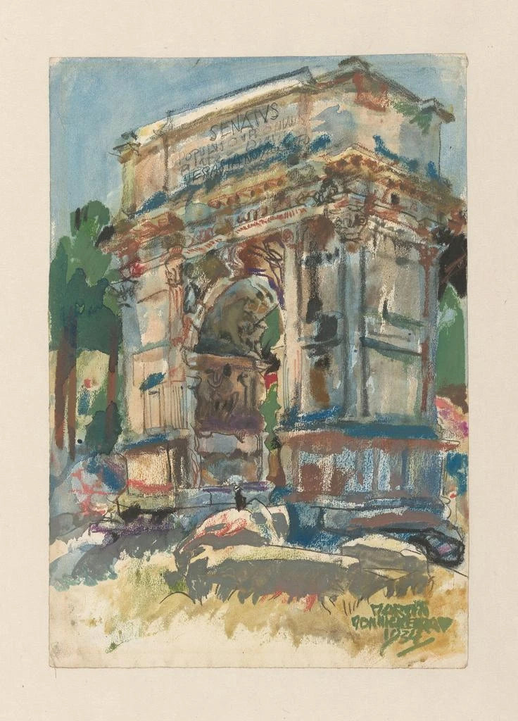 Martin Monnickendam, né à la fin du XIXe siècle, est un peintre néerlandais dont le travail s'inscrit dans un contexte historique riche. Influencé par le réalisme et l'impressionnisme, il a su capturer des scènes historiques et des paysages avec une grande finesse. L'arc de Titus, monument construit en 81 après J.-C. pour commémorer la victoire de l'empereur Titus, est un sujet qui résonne avec l'intérêt de Monnickendam pour l'histoire et l'architecture. En représentant ce monument, il témoigne de l'importance de la mémoire et de l'héritage culturel, tout en s'inscrivant dans une tradition artistique qui valorise le passé.