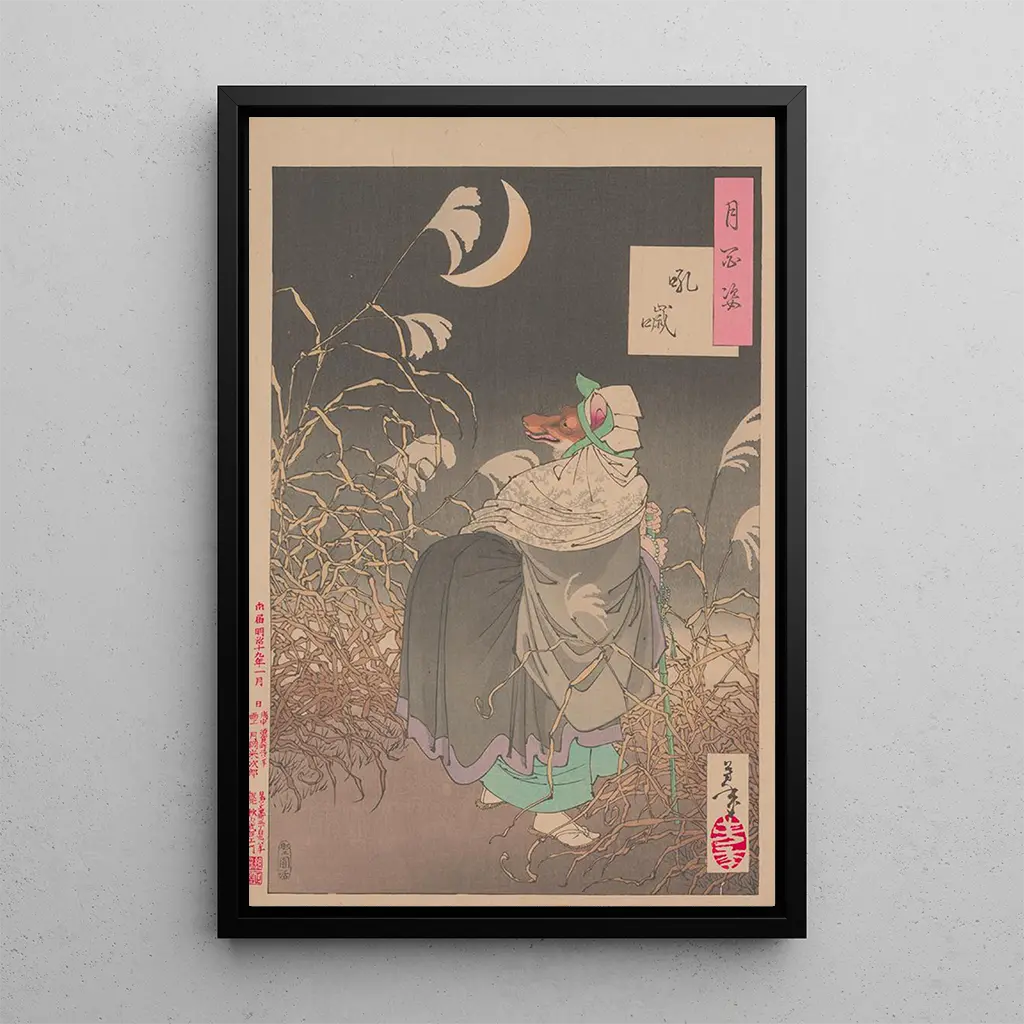 Dans cette reproduction du tableau "Le cri du renard Konkai", Tsukioka Yoshitoshi nous plonge dans un univers où la nature et le fantastique se rencontrent. Les couleurs vives et les traits délicats de l'artiste créent une atmosphère à la fois troublante et envoûtante. Le renard, symbole de transformation et de mystère dans la culture japonaise, semble émettre un cri qui résonne à travers le paysage nocturne. La technique de l'estampe ukiyo-e, caractéristique de Yoshitoshi, permet de capturer des détails saisissants, des ombres subtiles et des nuances de lumière qui donnent vie à cette scène énigmatique.