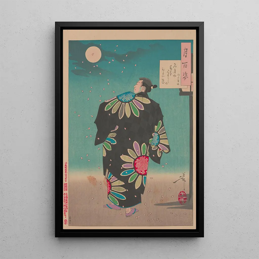 Fukami Jikyu daagt de maan uit: een dialoog tussen mens en universum In dit boeiende kunstdruk daagt Fukami Jikyu de maan uit, Tsukioka Yoshitoshi dompelt ons onder in een wereld waar natuur en menselijkheid samenkomen. De dynamische compositie, met vloeiende lijnen en levendige kleuren, roept een sfeer op die zowel mystiek als contemplatief is. De nuances van blauw en zilver, die de maan voorstellen, contrasteren met de warme tinten van de personages, waardoor een verbluffende visuele harmonie ontstaat. De ukiyo-e-techniek, kenmerkend voor Yoshitoshi, stelt ons in staat om diepe emoties vast te leggen, waardoor elk detail levendig en krachtig wordt. Dit kunstwerk nodigt de kijker uit om na te denken over zijn plaats in het universum, terwijl hij de schoonheid van het nachtlandschap bewondert. Tsukioka Yoshitoshi: meester van de ukiyo-e en getuige van zijn tijd Tsukioka Yoshitoshi, een van de laatste grote meesters van de ukiyo-e, heeft de 19e eeuw gemarkeerd met zijn innovatieve en expressieve kunstdrukken. Geboren in 1839, werd hij beïnvloed door de sociale en politieke veranderingen van zijn tijd, waaronder de opening van Japan naar het Westen. Zijn kunstdrukken, vaak geïnspireerd door legendes, historische verhalen en het dagelijks leven, weerspiegelen een diepe begrip van menselijke emoties. Yoshitoshi wist traditie en moderniteit te combineren, waardoor hij een iconische figuur werd in de Japanse kunst. Zijn vermogen om vluchtige momenten vast te leggen en om te zetten in visuele verhalen heeft een blijvende erfenis achtergelaten, die vele hedendaagse en toekomstige kunstenaars heeft beïnvloed. Een decoratief kunstdruk met vele voordelen De kunstdruk van Fukami Jikyu daagt de maan uit is een decoratief stuk dat uw interieur zal verrijken, of het nu een woonkamer, kantoor of slaapkamer is. De kwaliteit van de afdruk en de trouw aan het originele kunstwerk garanderen een uitzonderlijke visuele ervaring, terwijl het een vleugje elegantie en cultuur aan uw ruimte toevoegt. Dit kunstwerk, met zijn heldere kleuren en poëtische boodschap, trekt de aandacht en stimuleert gesprekken. Door voor deze kunstdruk te kiezen, kiest u voor een tijdloos kunstwerk dat esthetiek en diepgang combineert, terwijl u het artistieke erfgoed van Japan viert.
